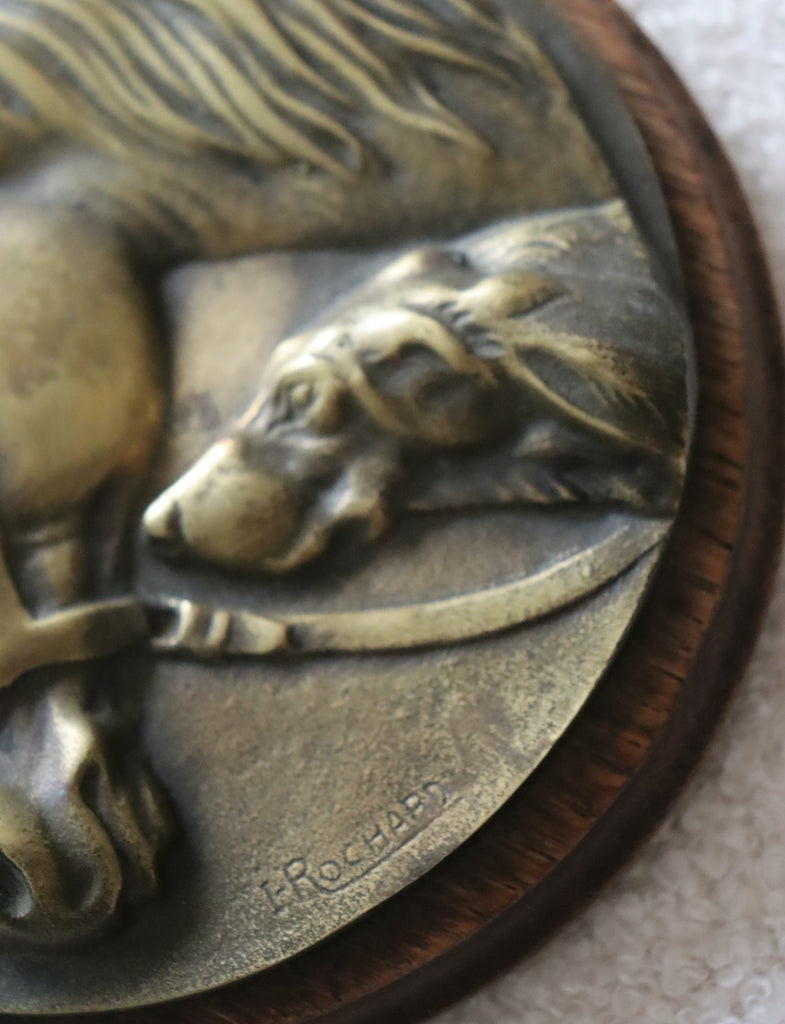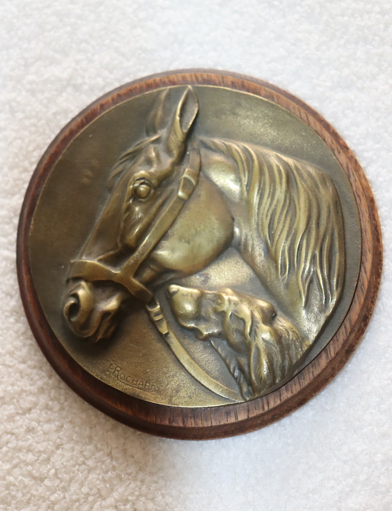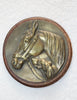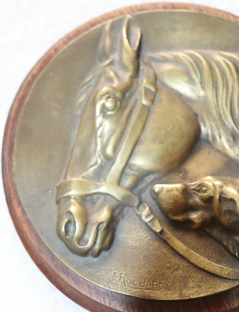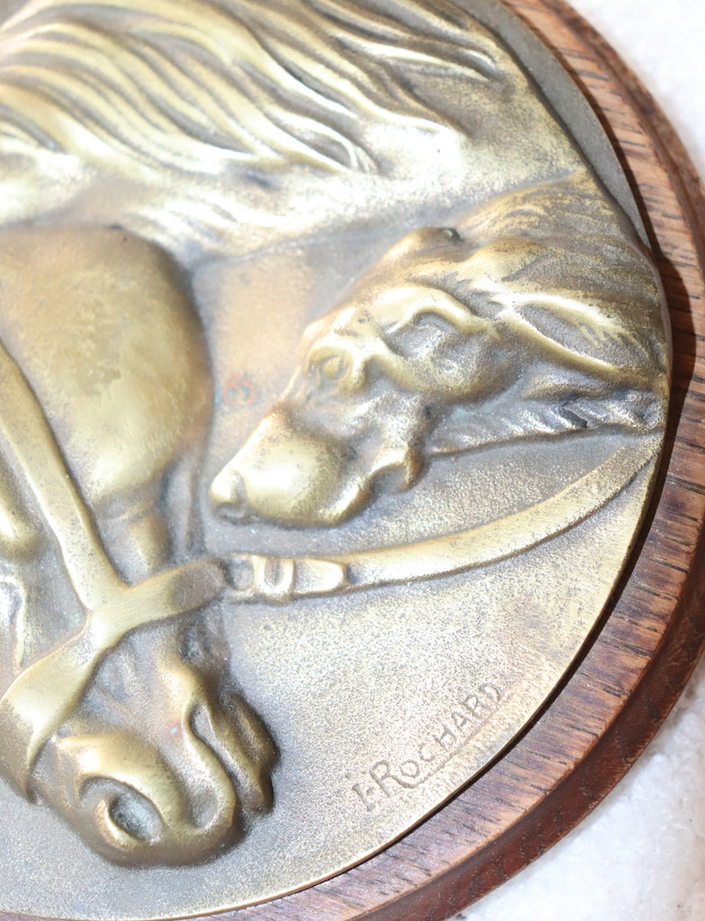 Très joli médaillon en bronze sur bois, figurant une belle tête de cheval et une autre tête de chien.