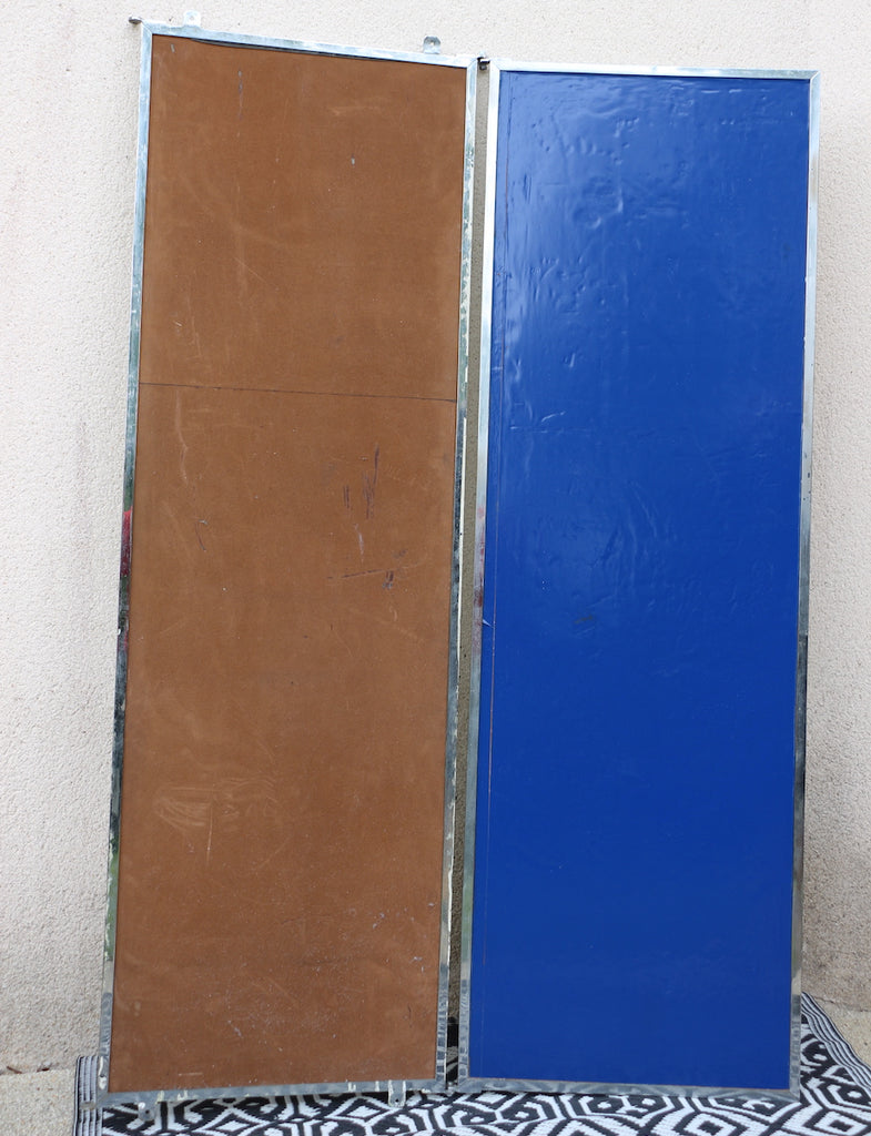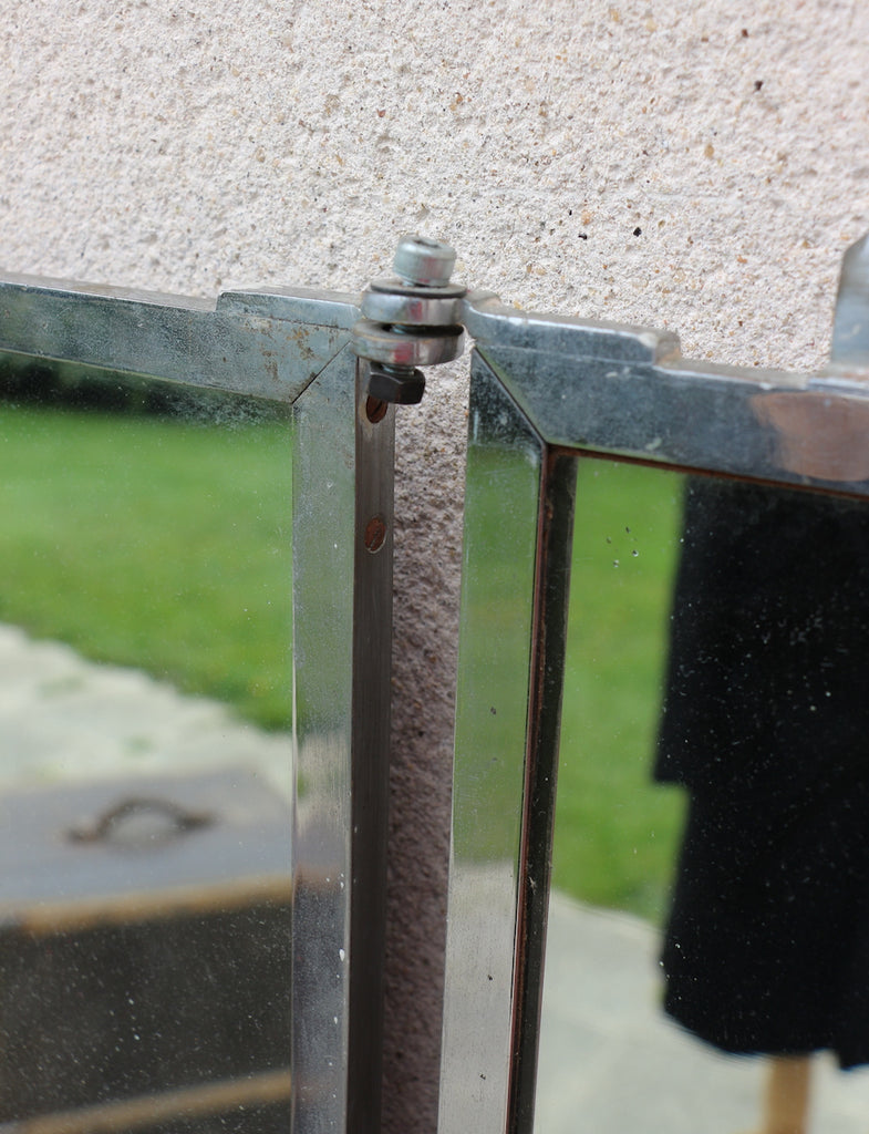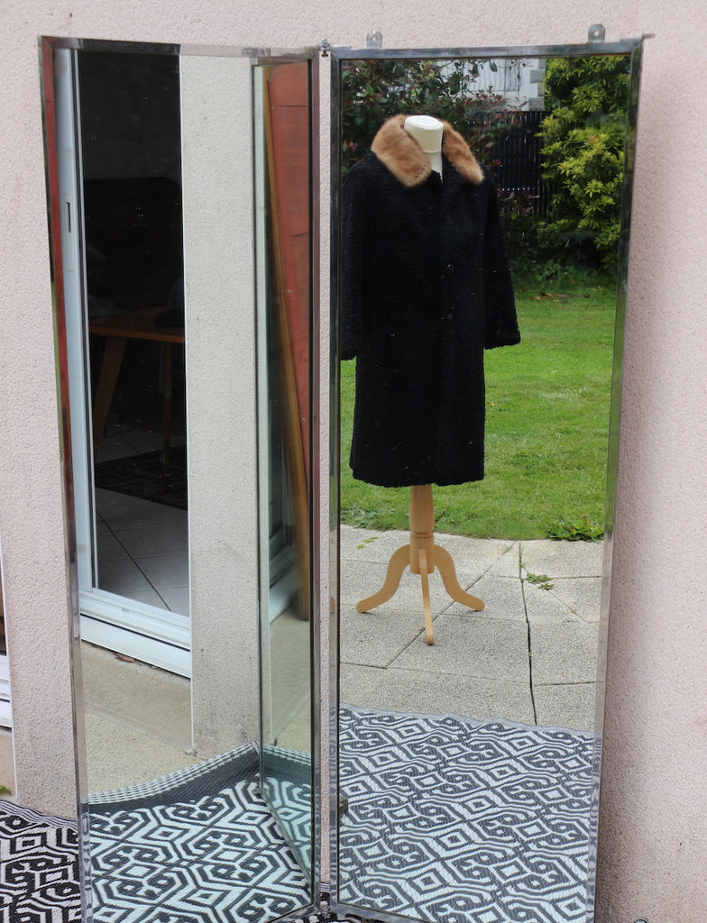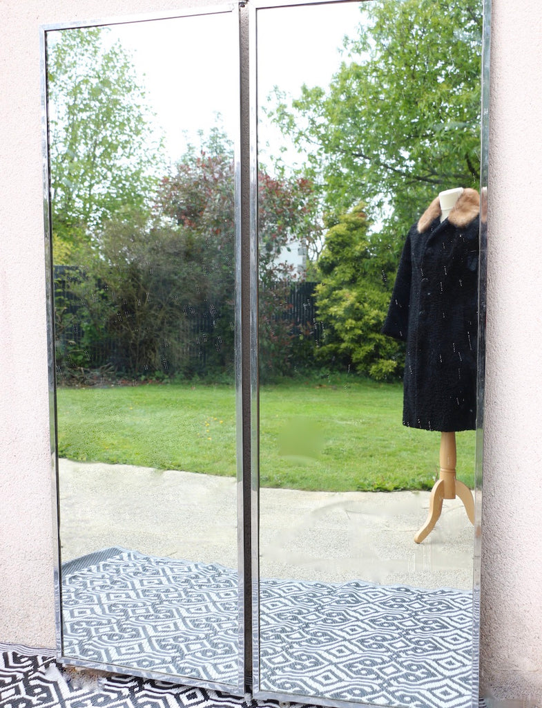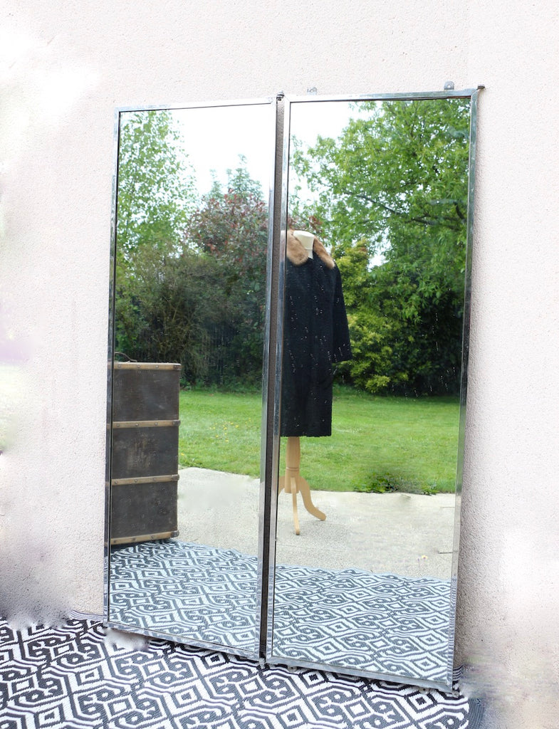 Voici un grand miroir de tailleur, ou de couturier, d'une grande rareté, avec deux panneaux, entourés de métal dans un style caractéristique du monde industriel.