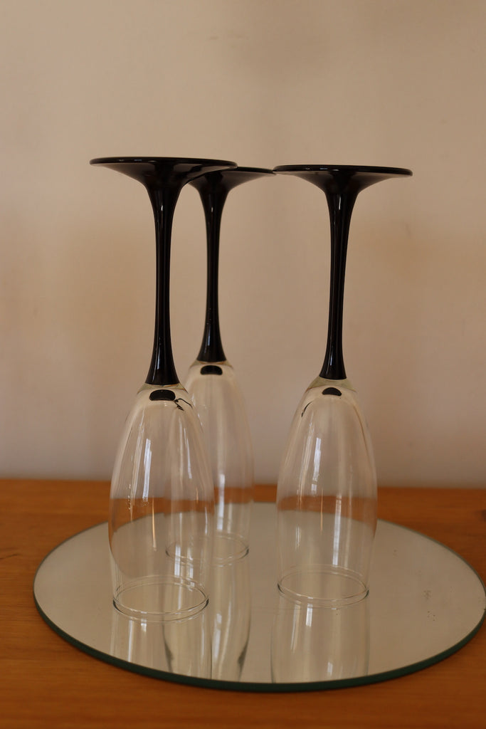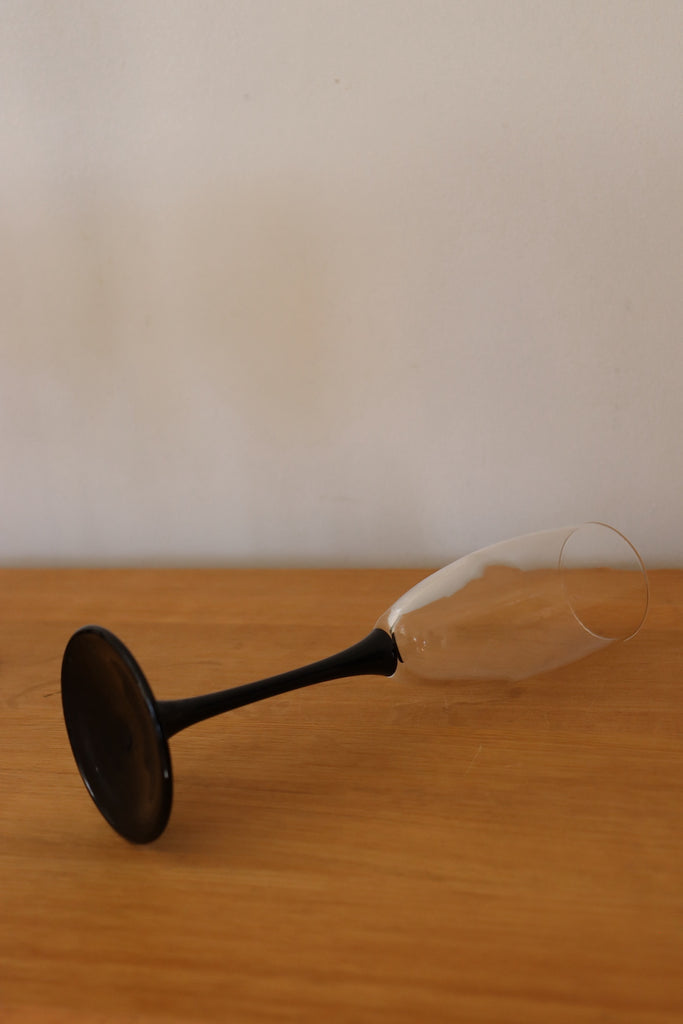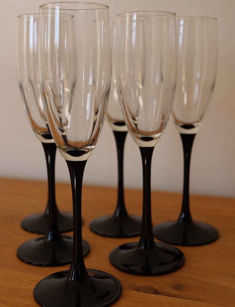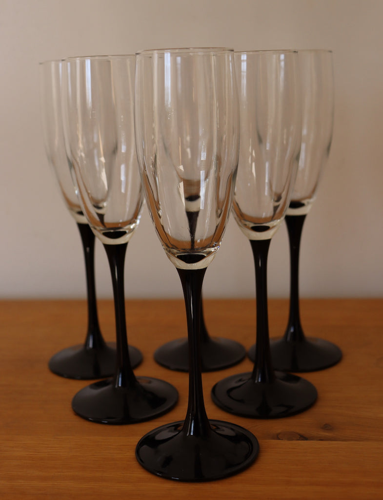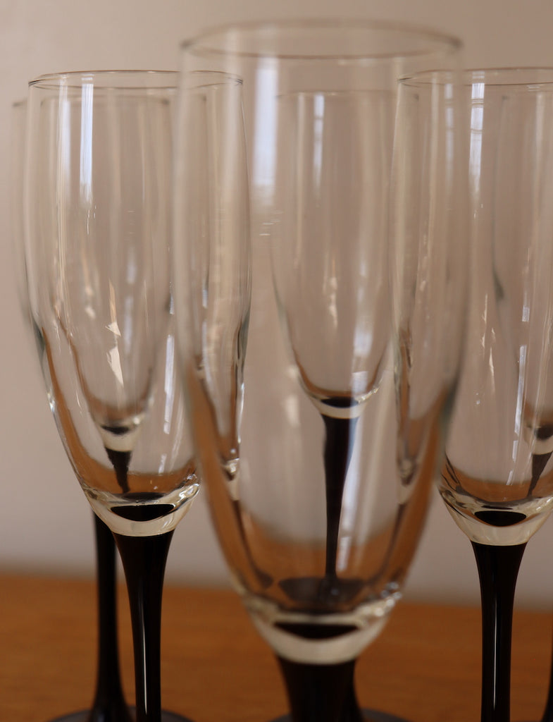 Nous proposons  6 flûtes à champagne en parfait état, "Made in France". Le verre est monté sur un pied de couleur noir. Nous avons plusieurs lots de 6 flûtes en stock, si vous le souhaitez.