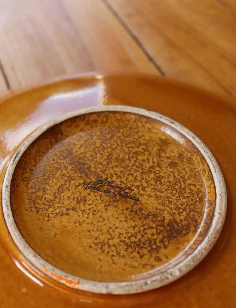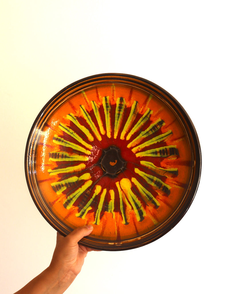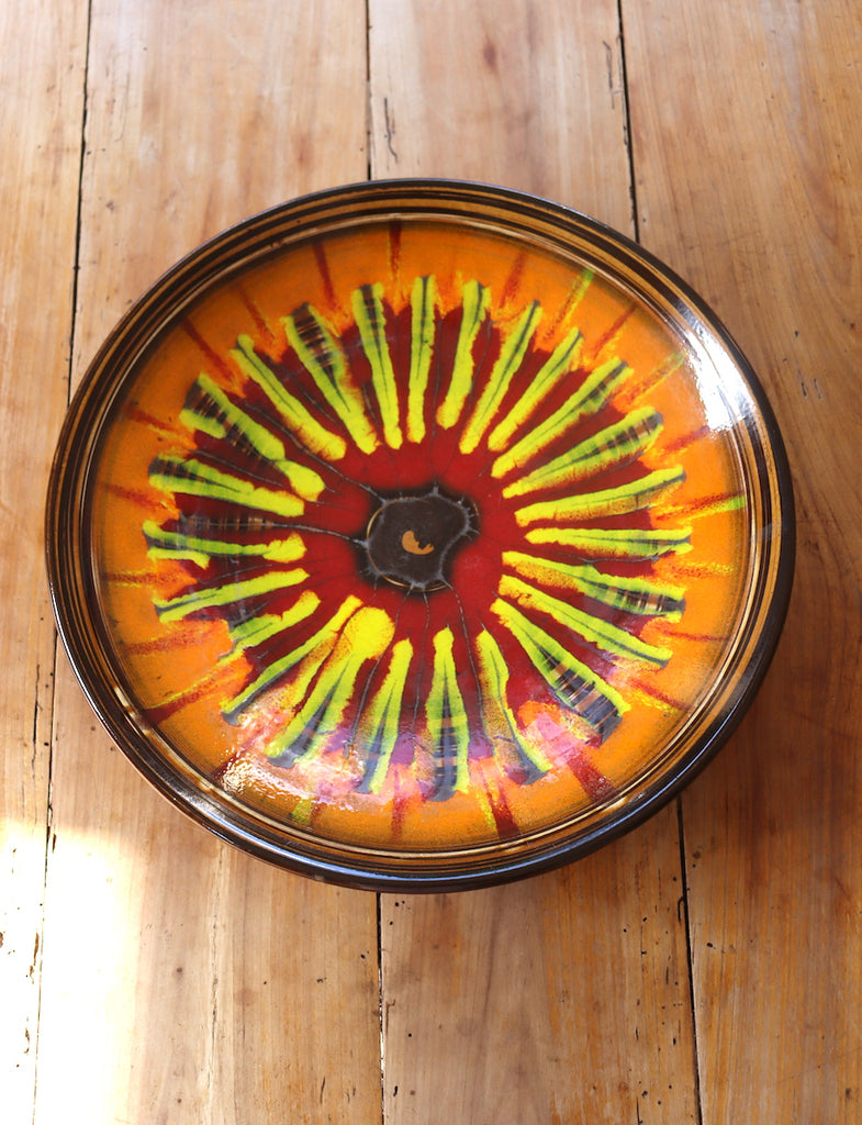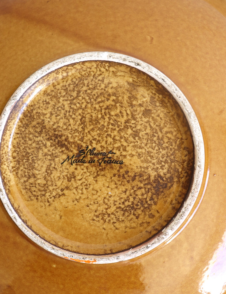 Nous présentons ici un magnifique plat à la belle signature "St Clément". La signature d'ailleurs est surtout présente dans la luminosité qui émane de cette grande coupe où orange et brun se disputent pour présenter des coloris dont on pourrait dire qu'ils illuminant l'espace où ce grand plat est disposé.