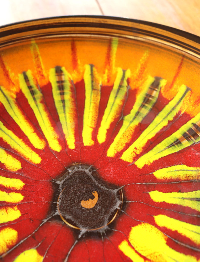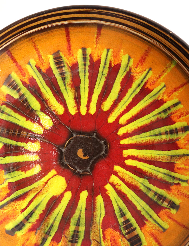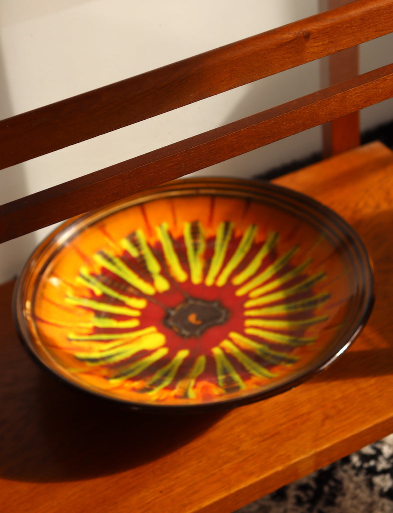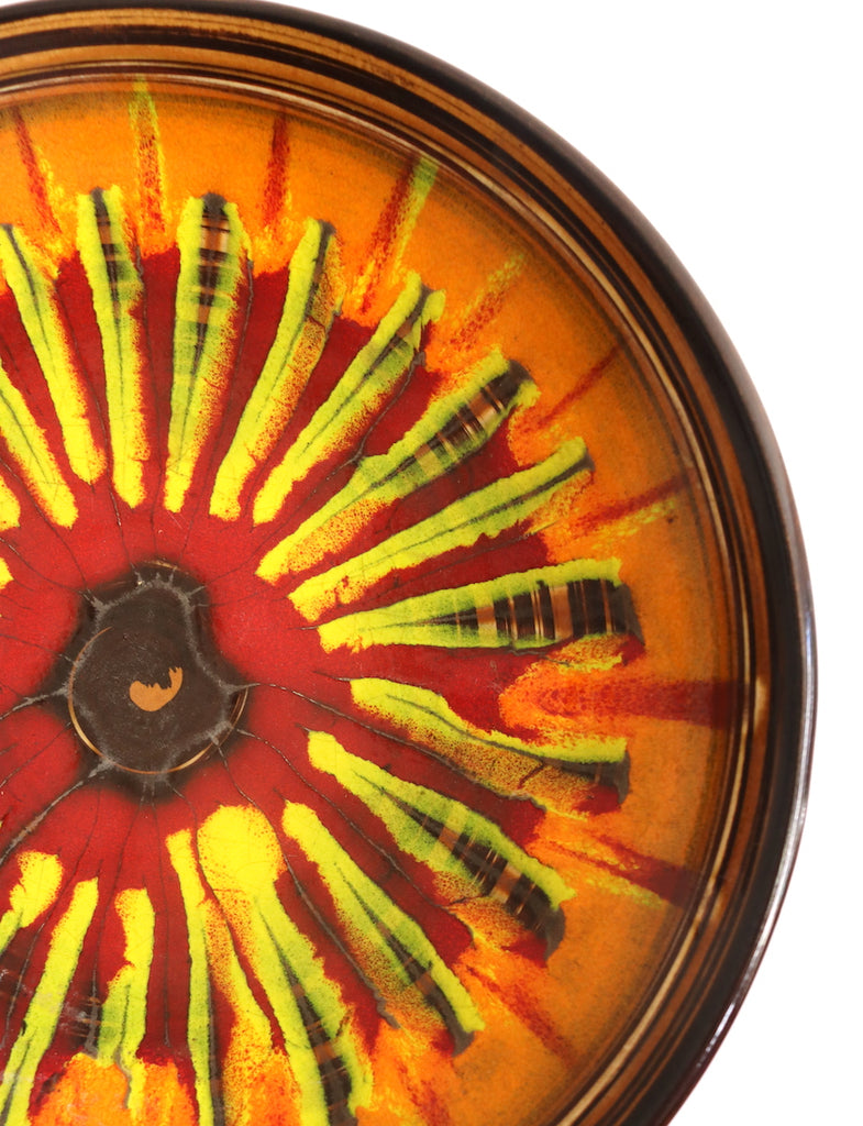 Nous présentons ici un magnifique plat à la belle signature "St Clément". La signature d'ailleurs est surtout présente dans la luminosité qui émane de cette grande coupe où orange et brun se disputent pour présenter des coloris dont on pourrait dire qu'ils illuminant l'espace où ce grand plat est disposé.