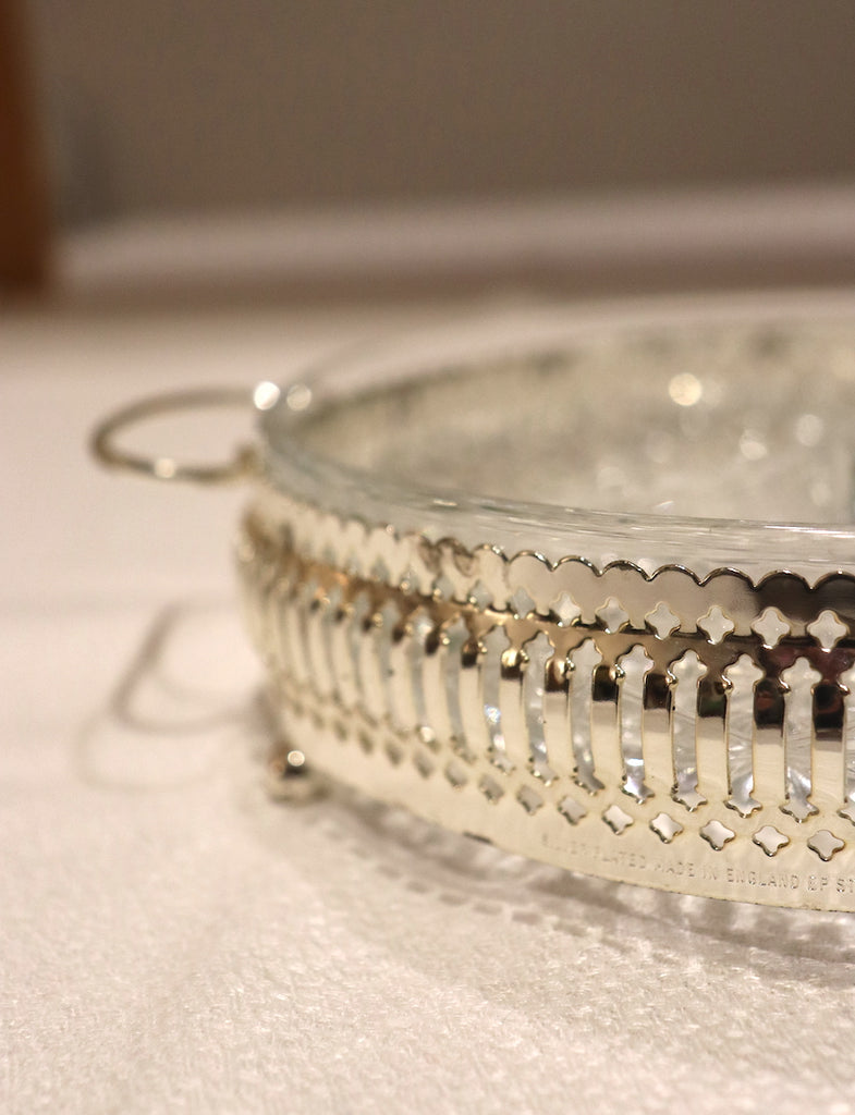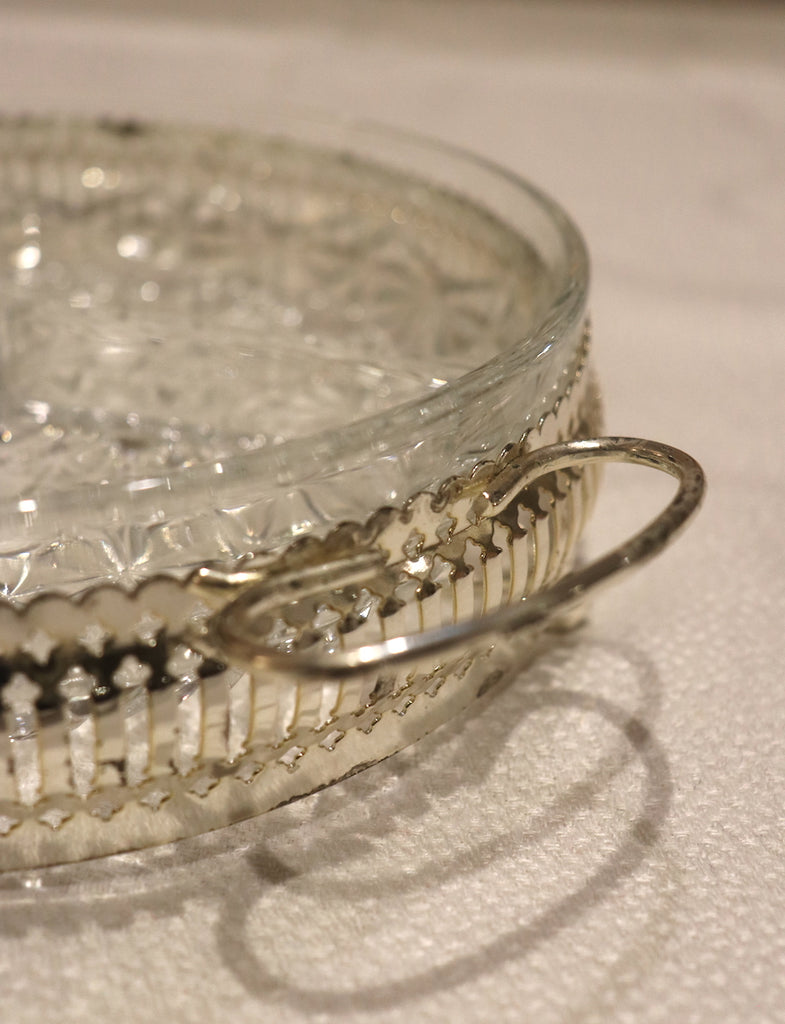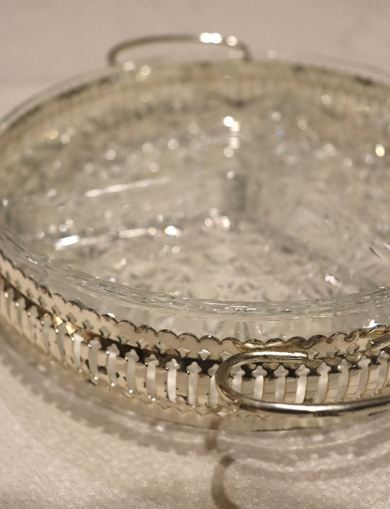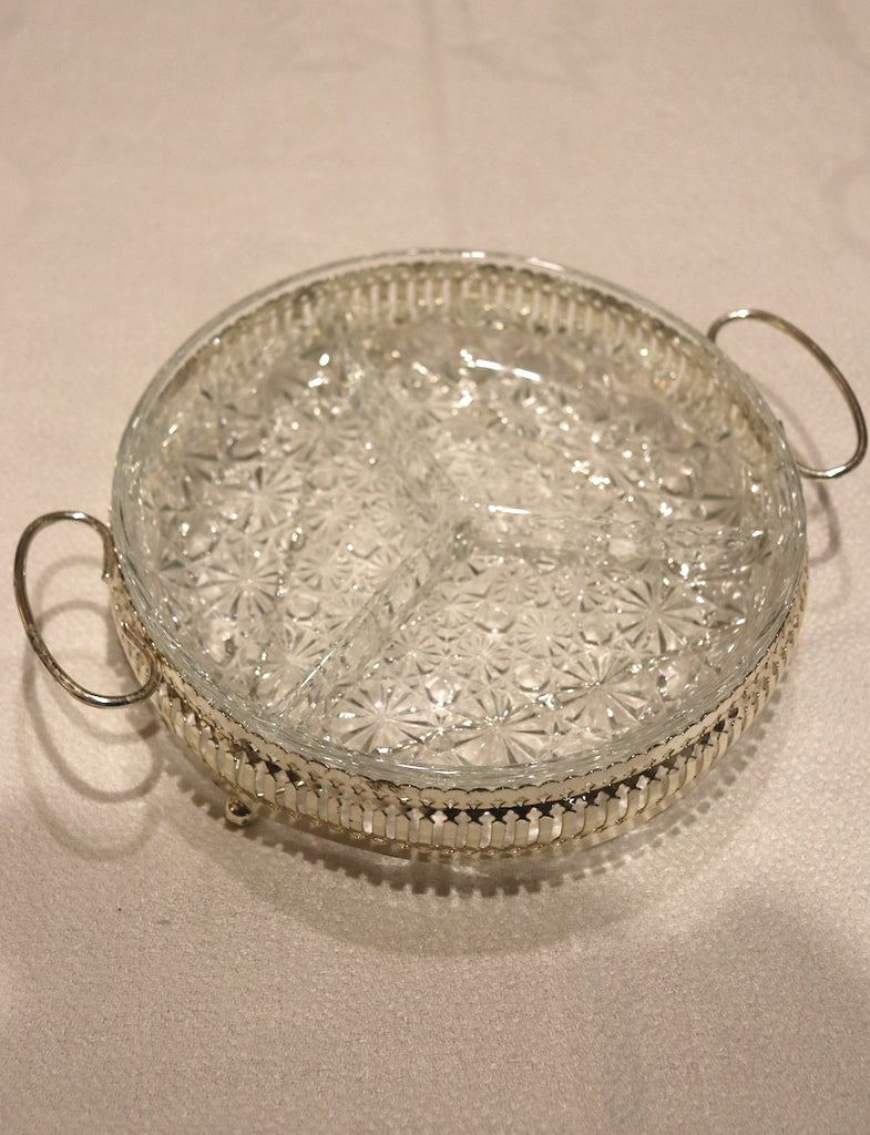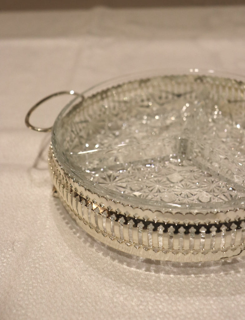 Cette belle coupe à compartiments est dotée d'un support argenté pour le service, par exemple en apéritif. Trois compartiments pour tous les goûts. Les lignes sont élégantes et le métal joliment argenté.