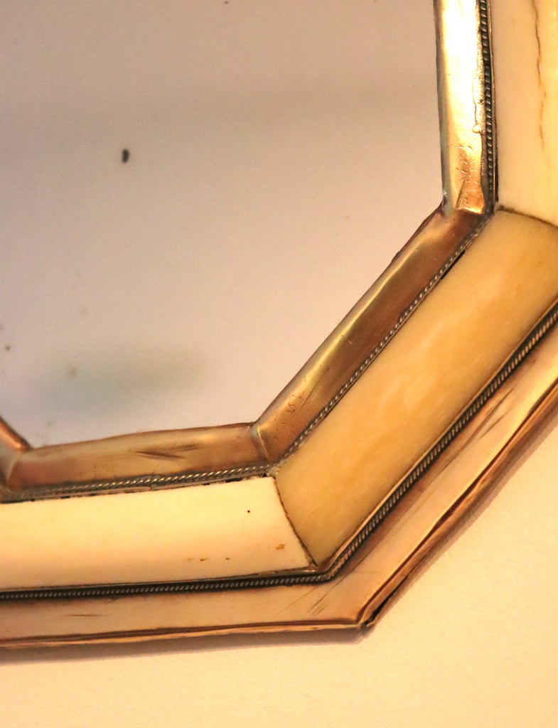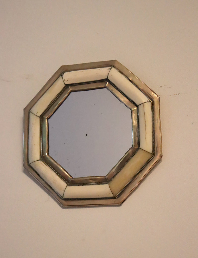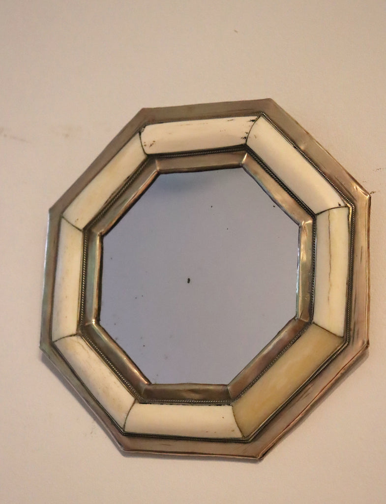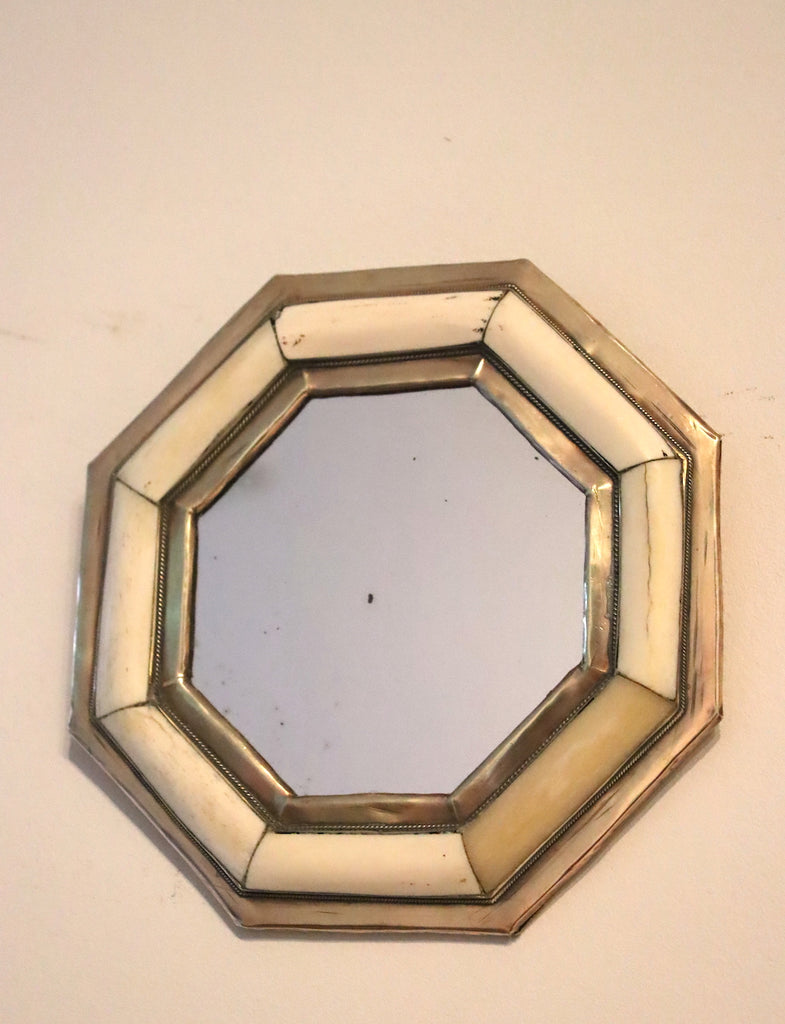 Voici un joli petit miroir de style nord africain qui associe un cadre de laiton agrémenté de corne.