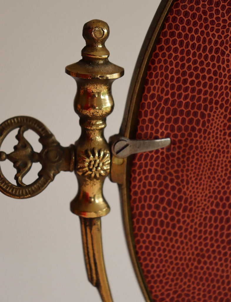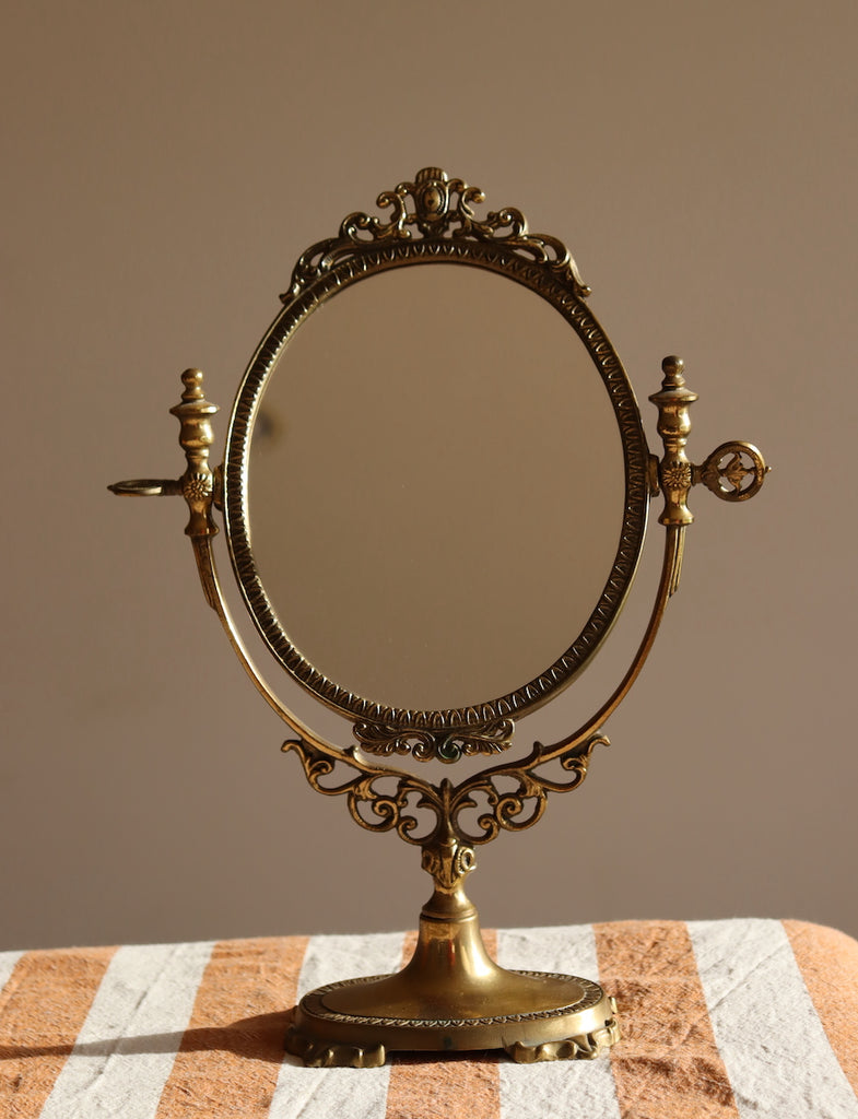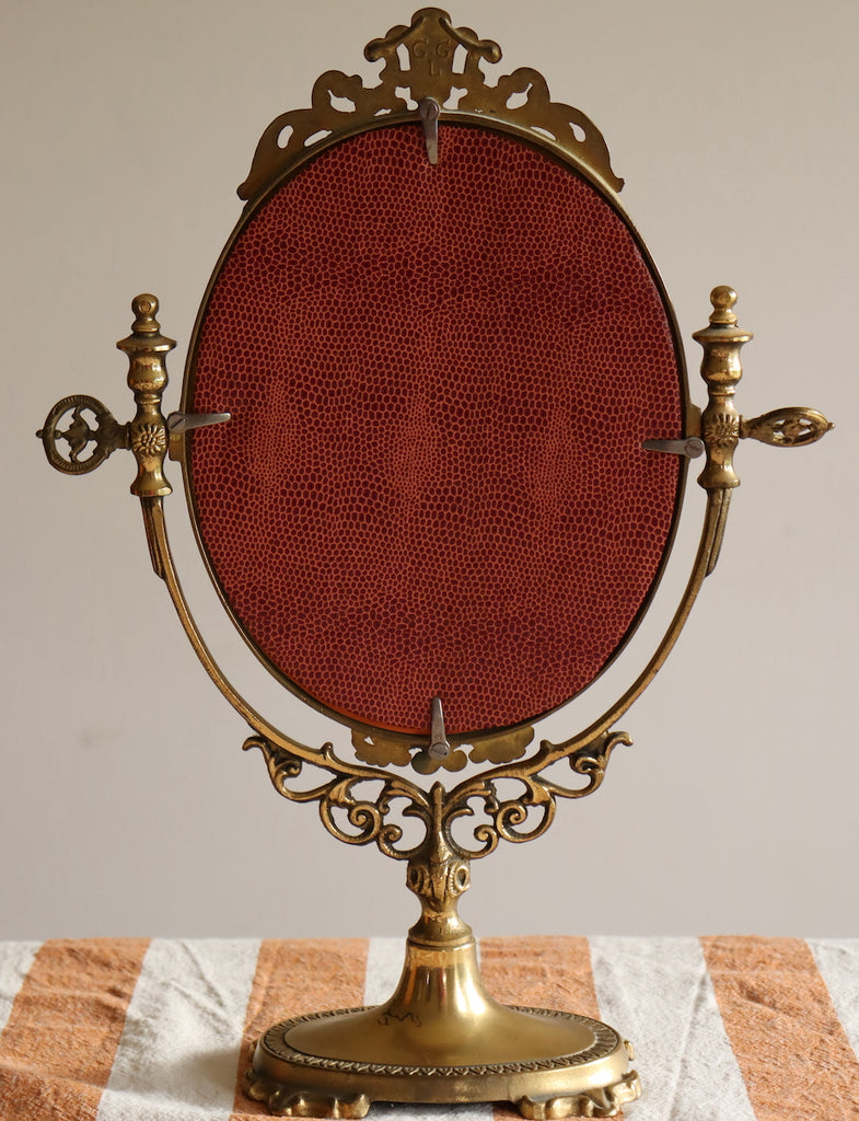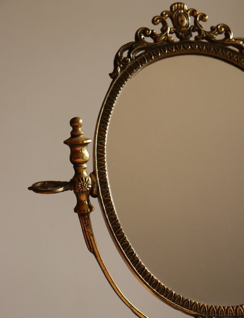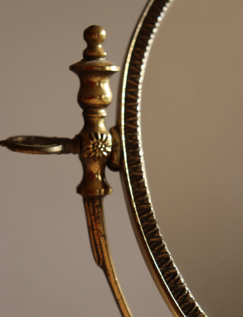 Voici un miroir de table à poser, psyché légèrement ovale et très chic, présentant des lignes élégantes pour un décor romantique à souhait.