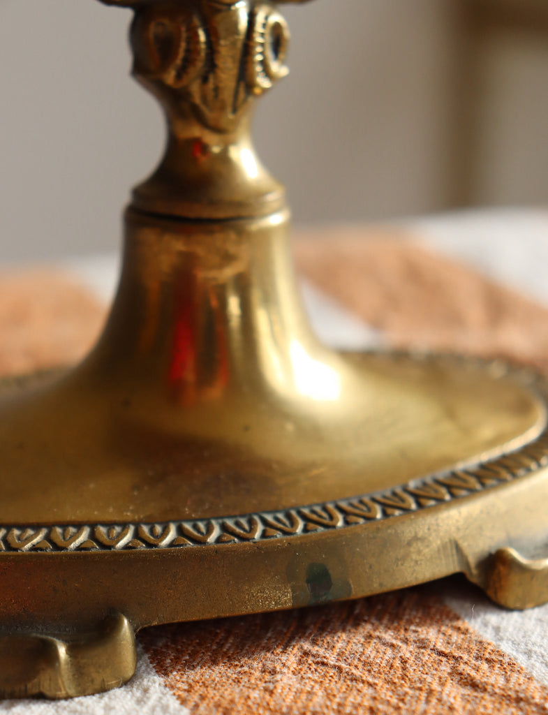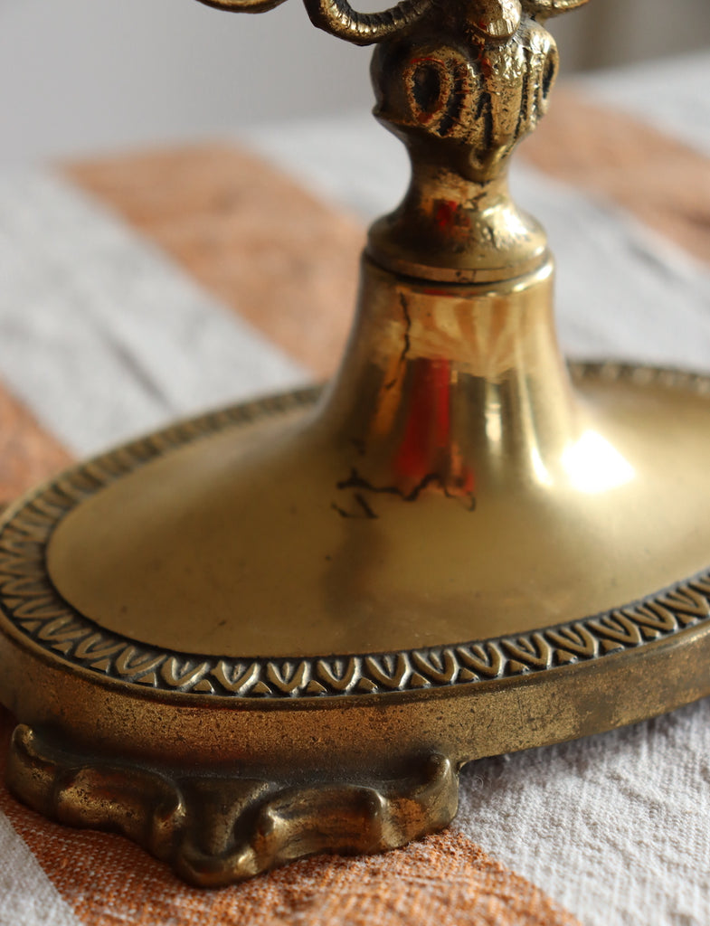 L'ensemble  est de belles proportions et stable grâce à un socle posé sur 4 pieds offrant à la fois du poids et une belle surface de base, garante de son équilibre. Ce socle décoré d'une jolie frisée en pourtour vient faire écho à l'encadrement du miroir pour des formes elles-mêmes en harmonie.