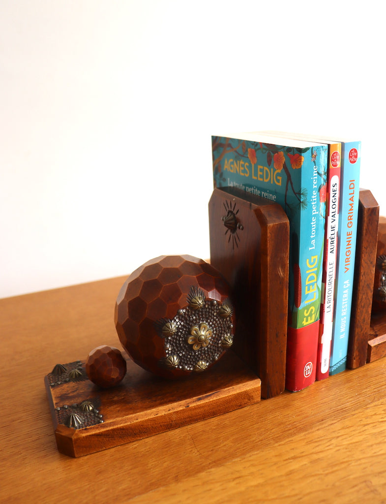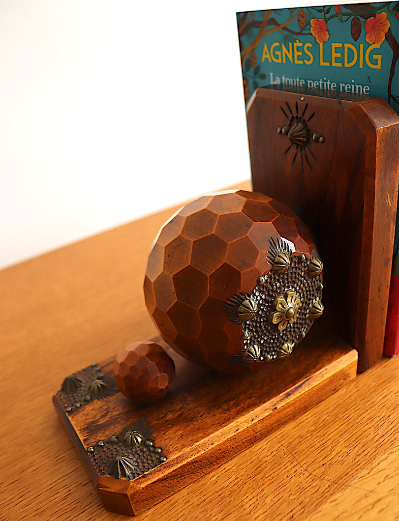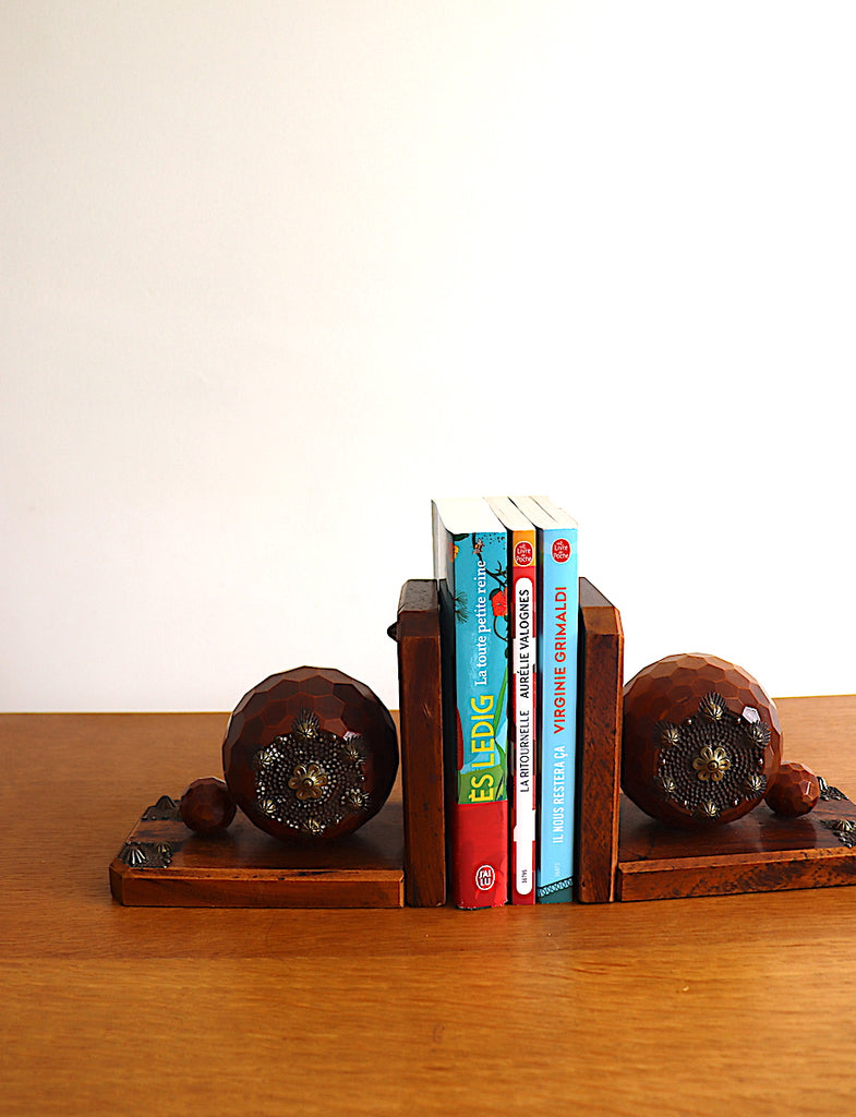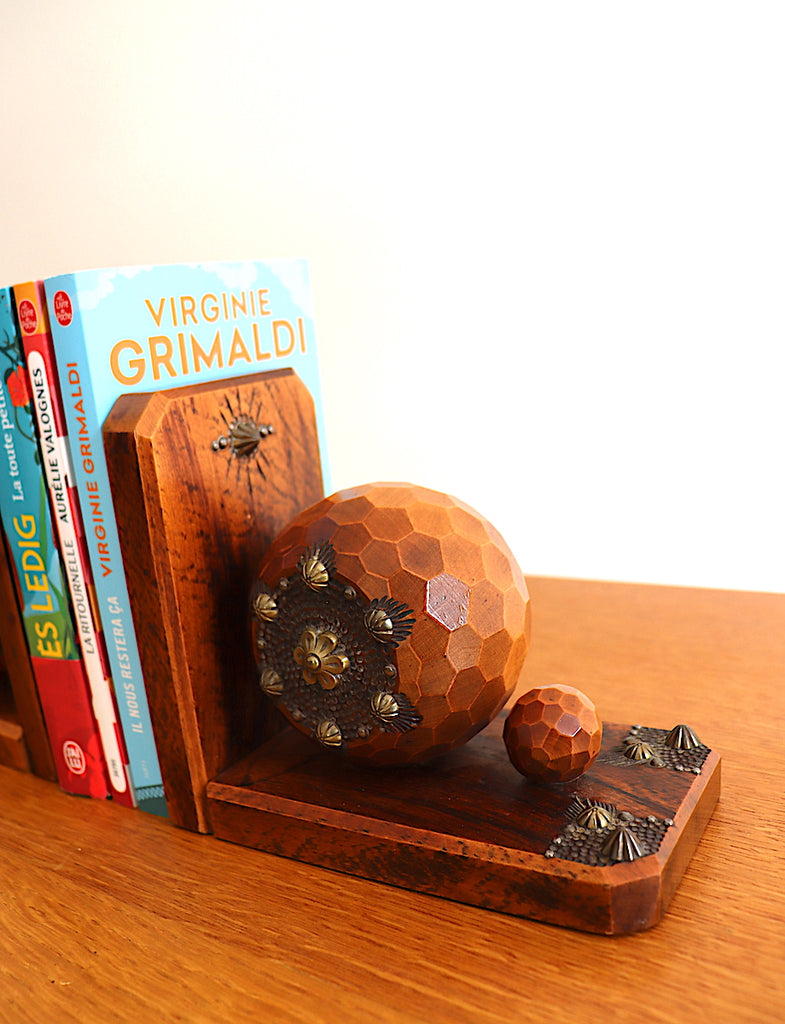 Voici un Serre livres, en bois agrémenté de quelques clous de laiton. Il présente en décoration deux boules de bois à facettes, l'une plus petite que l’autre.