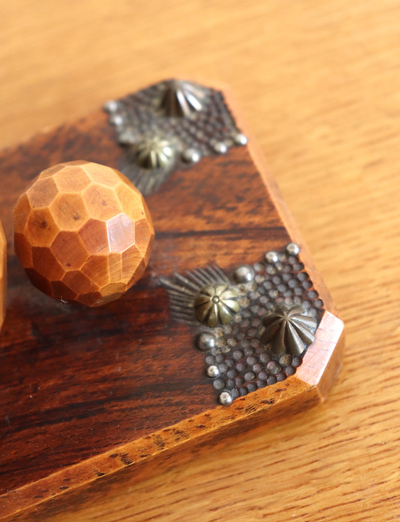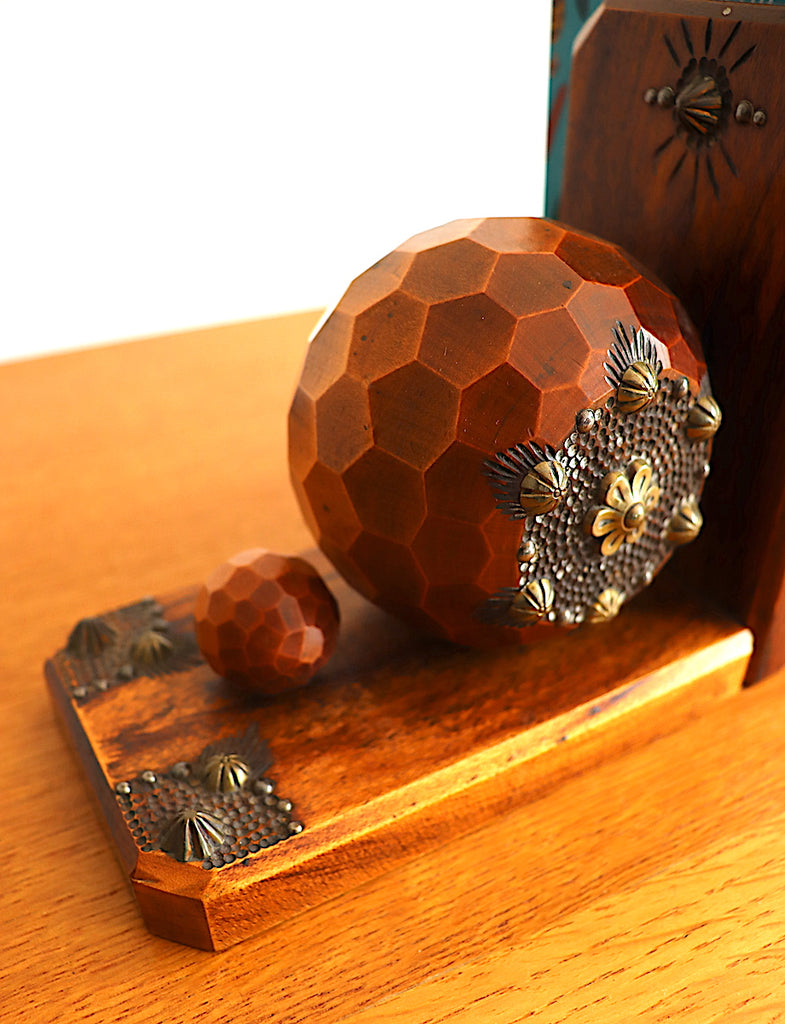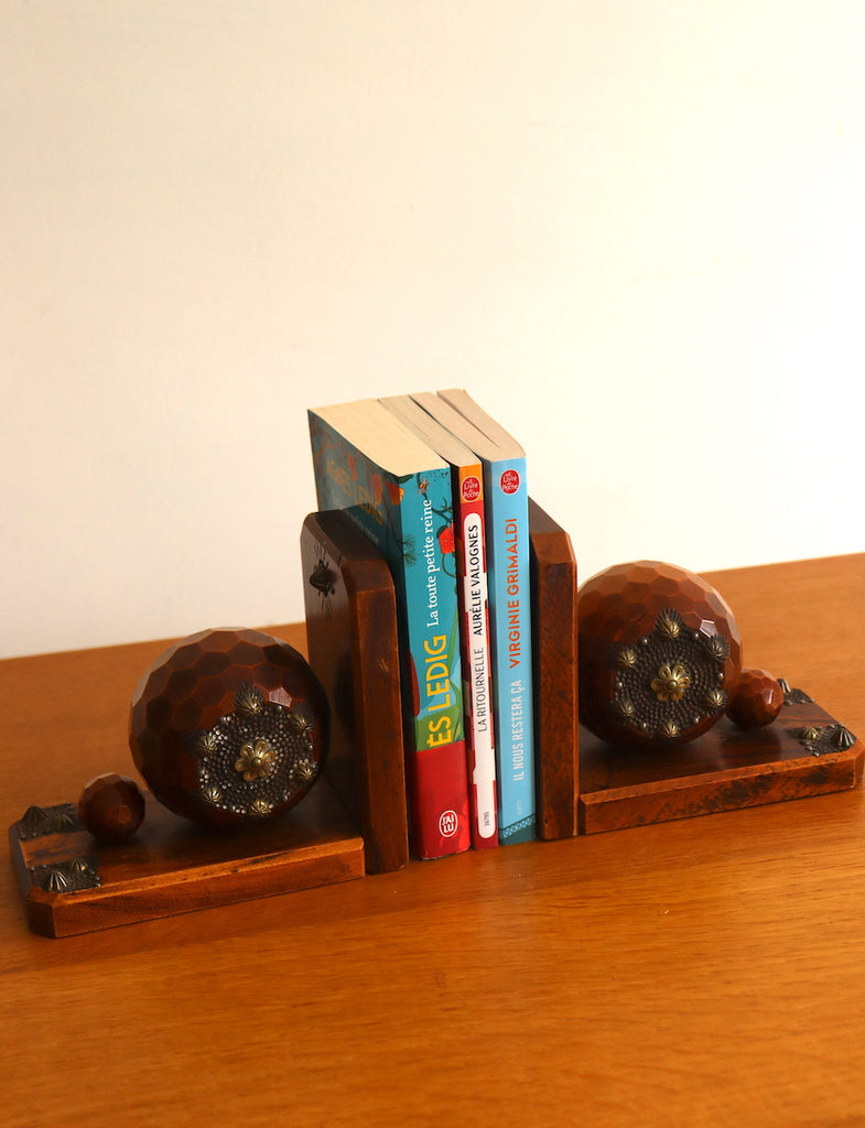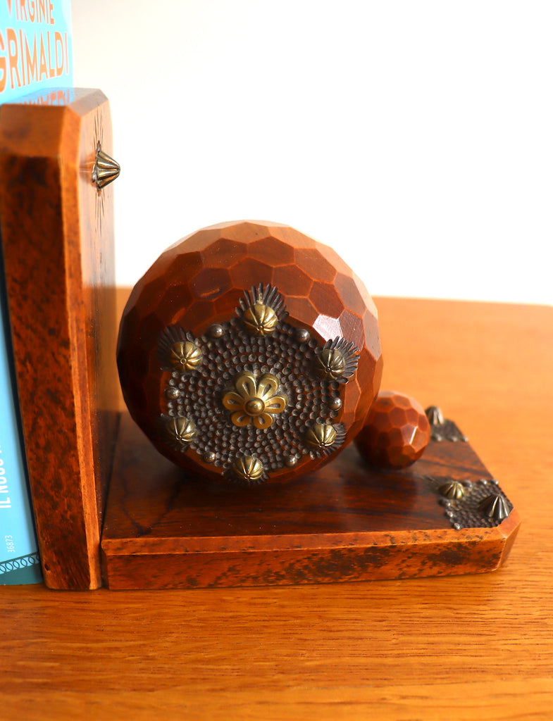 Voici un Serre livres, en bois agrémenté de quelques clous de laiton. Il présente en décoration deux boules de bois à facettes, l'une plus petite que l’autre.