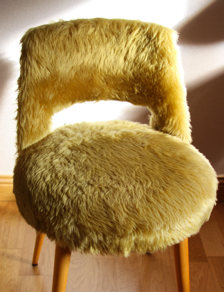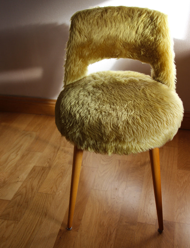 Superbe chaise moumoute de couleur moutarde à la taille d'un enfant.