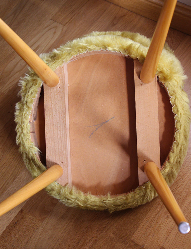 Matière : Des pieds fuseaux en compas et une assise circulaire recouverte d'une  moumoute acrylique. Le tout est en très bon état. Sans marque visible, sans doute Pelfran.