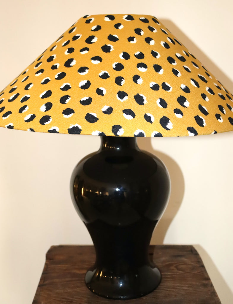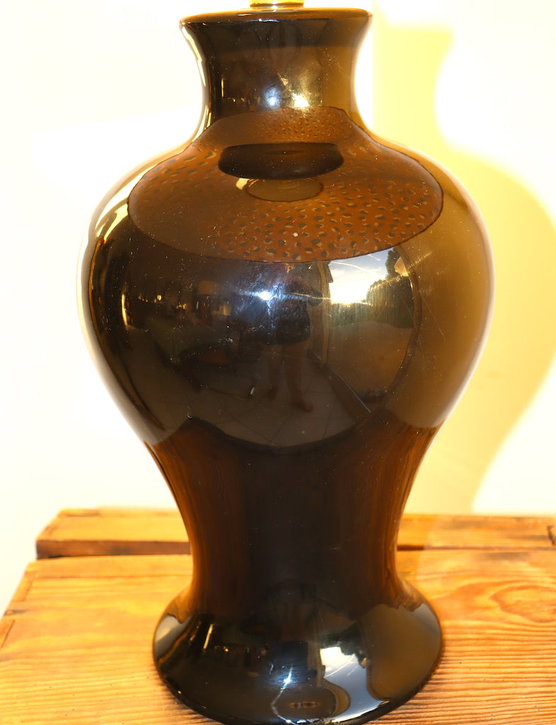 Lampe de salon ou d'ambiance, de belle taille et d'une étonnante prestance, le pied en faïence noir des années 90, s’harmonise avec l’abat jour.