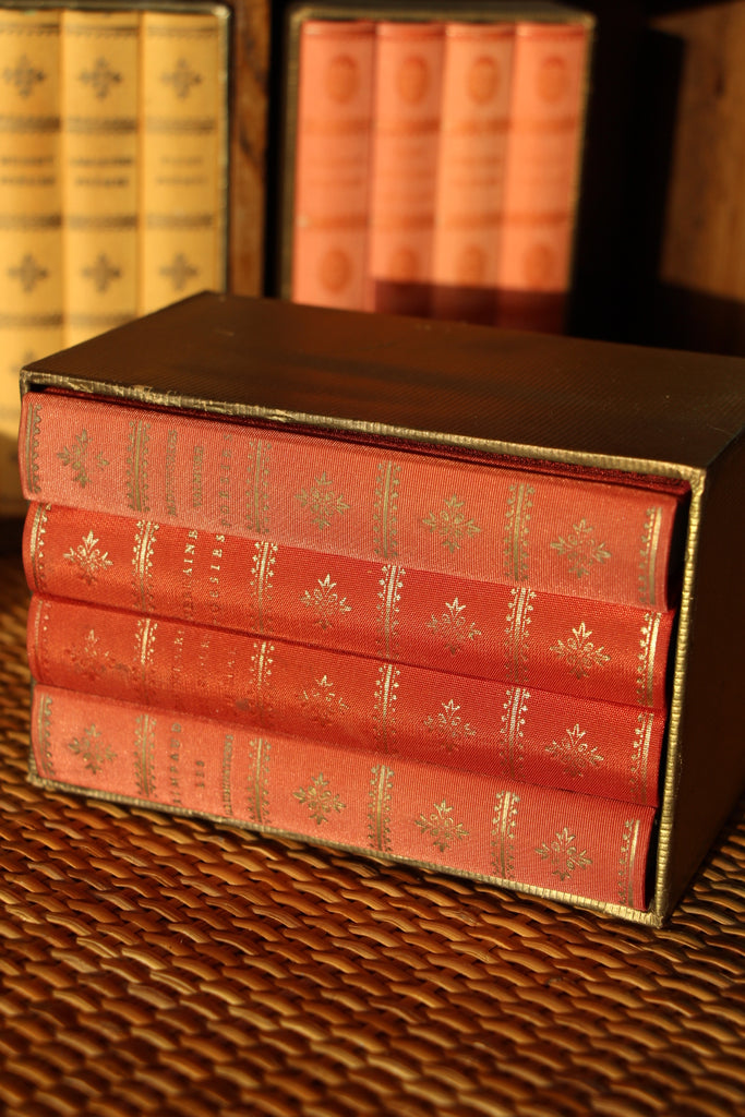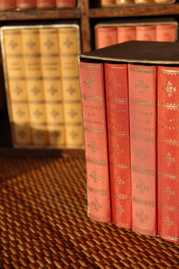Nous proposons ici 5 boîtes de 4 livres chacune (soit 20 lectures différentes). Il s'agit des publications Tchou pour la collection "Le livre de chevet - Bibliothèque de Poésie" éditée en 1966. Les livres sont en parfait état, et le cartonnage d'origine. La tranche supérieure est même dorée.