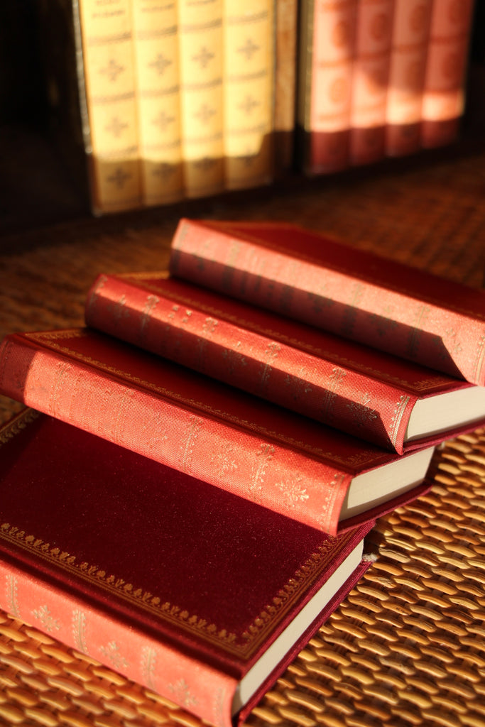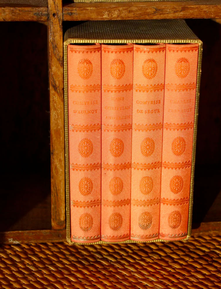 Matière : papier. Les couleurs du tissu qui les recouvre ont subi les épreuves de la lumière et comme en attestent les photos elles ont perdu un peu de leur éclat. Mais les livres sont dans un état impeccable, jusqu'aux signets qui sont comme neufs.