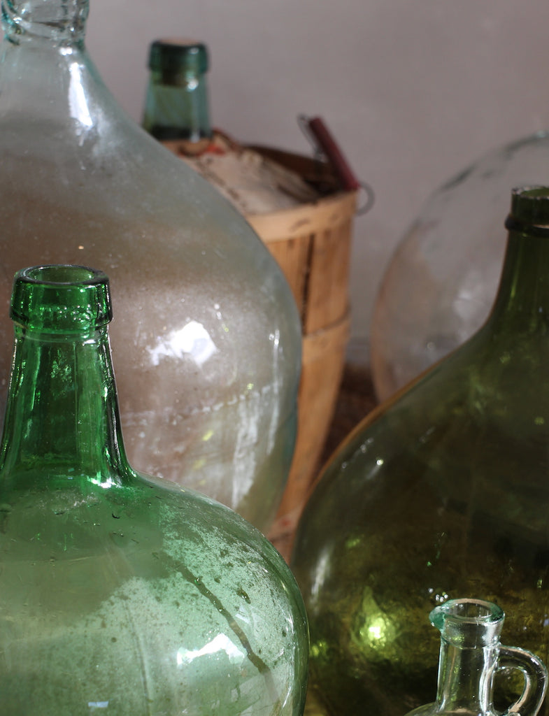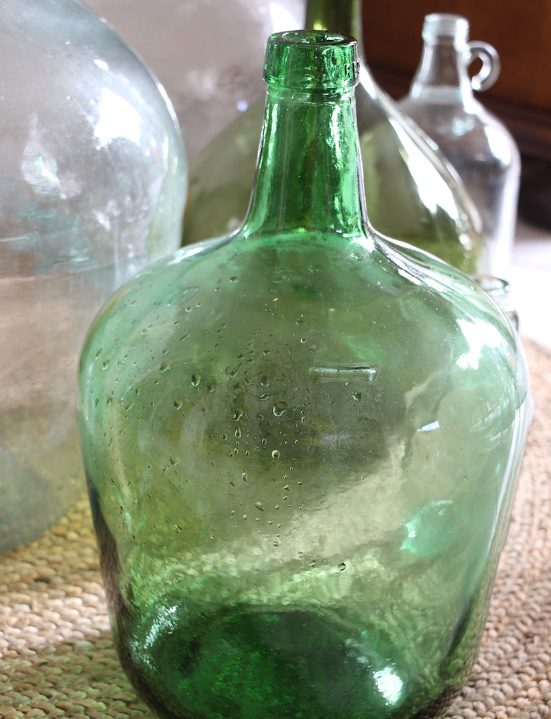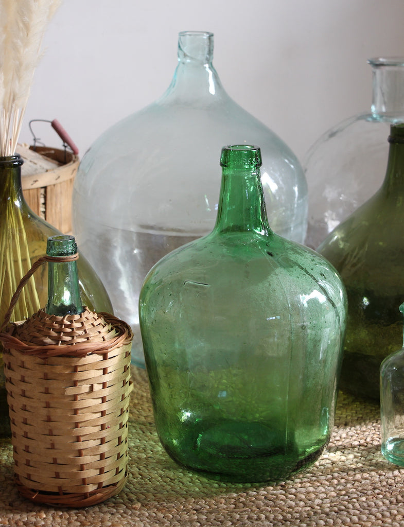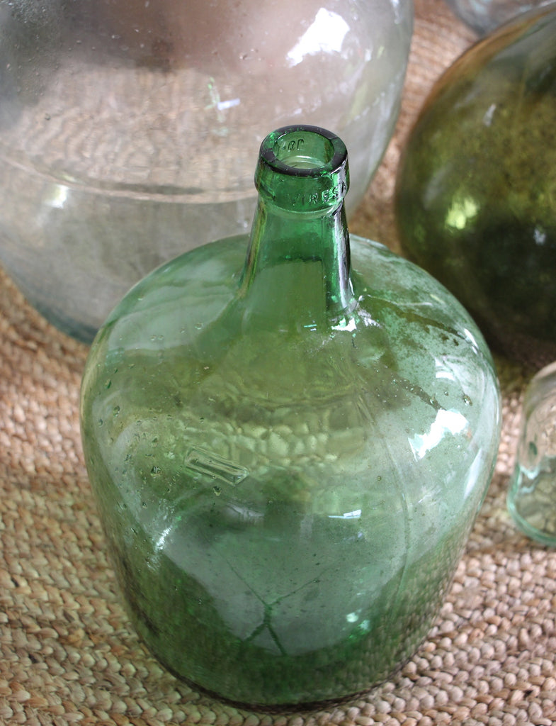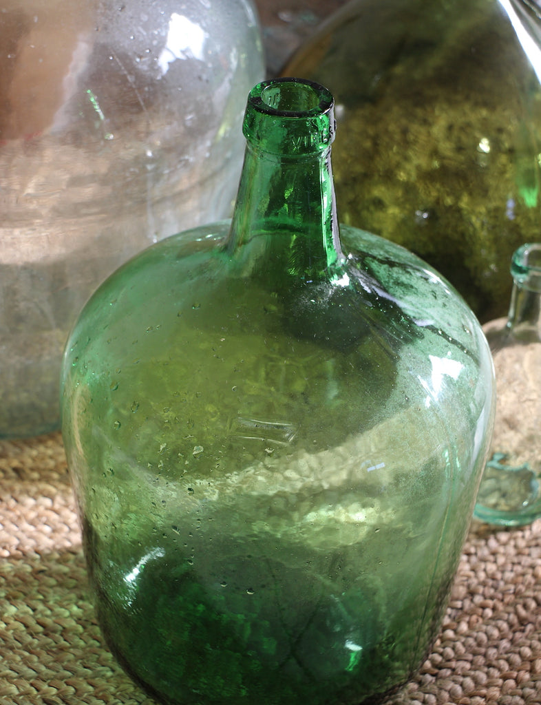 Voici une touque ancienne, qui était recouverte d'osier, mais dont le "déshabillage" a permis de mettre à jour un objet aux beaux volumes et surtout au verre d'une couleur claire du plus bel effet.