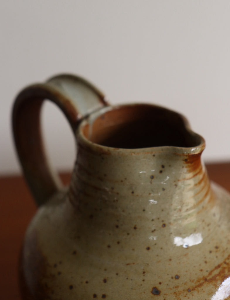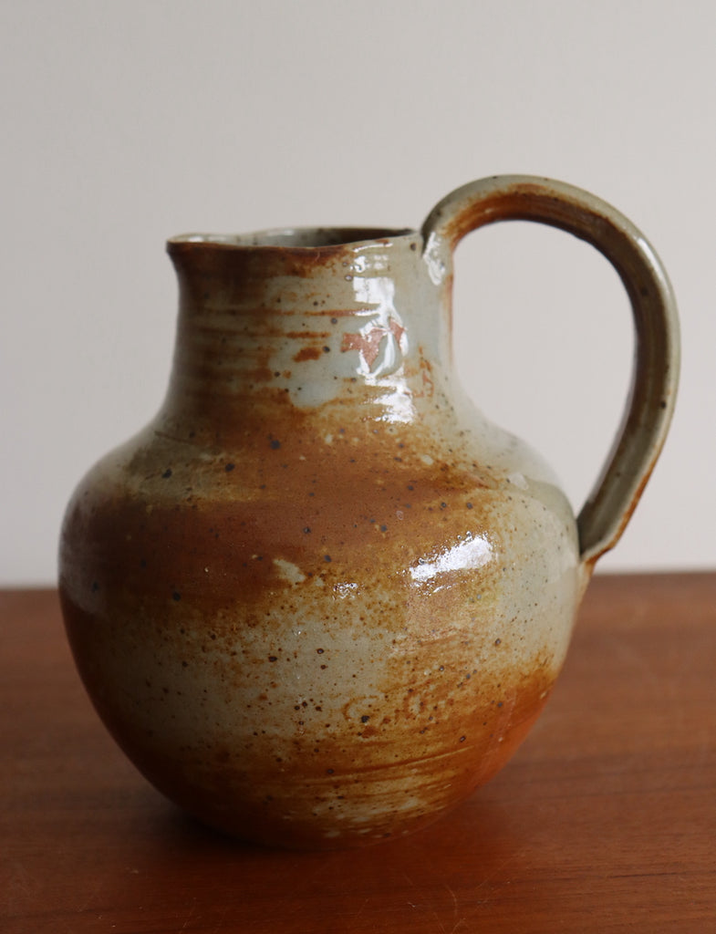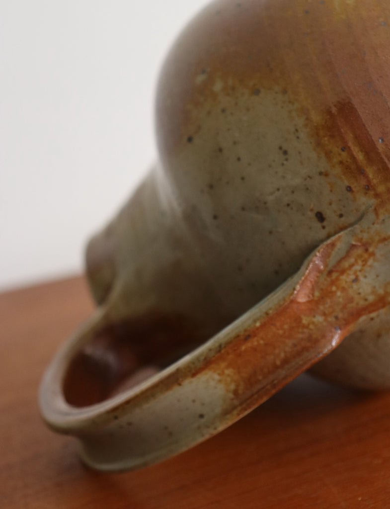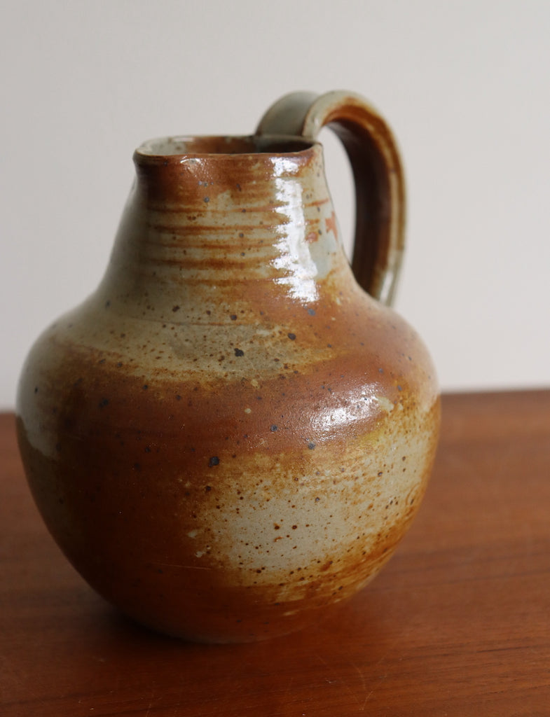 Très joli pot en grès vernissé aux superbes lignes, ventru puis élancé vers le col. Il possède une anse assez ample pour ses proportions qui facilite la préhension.