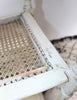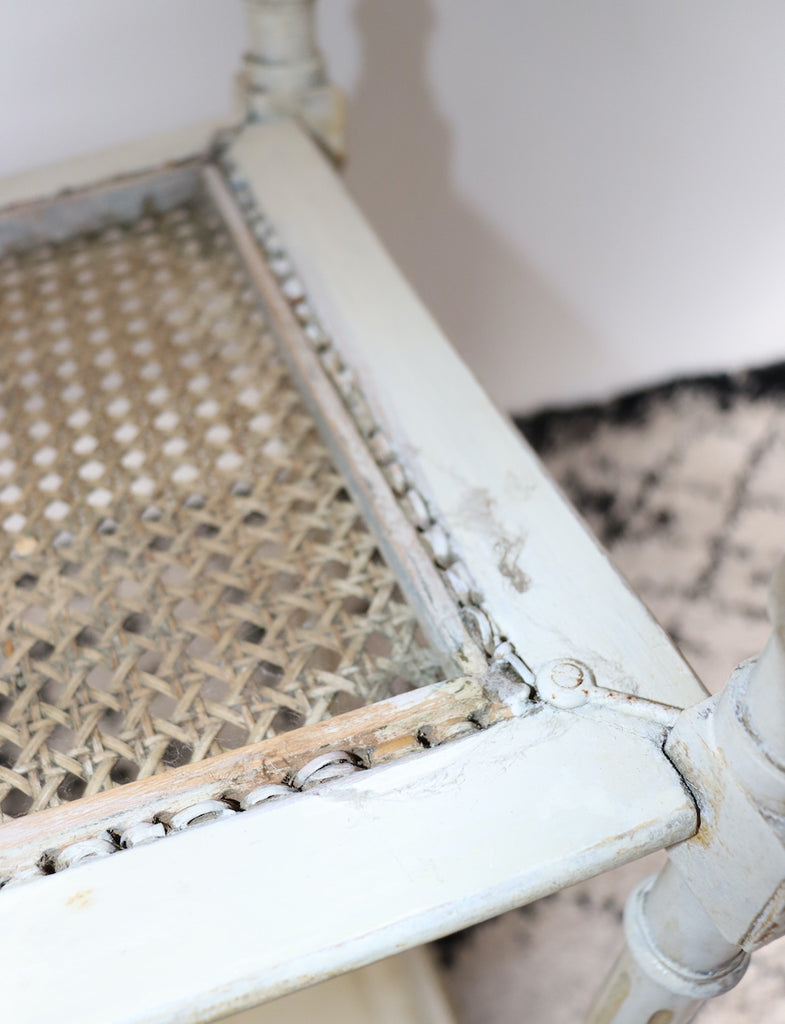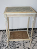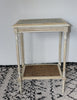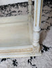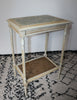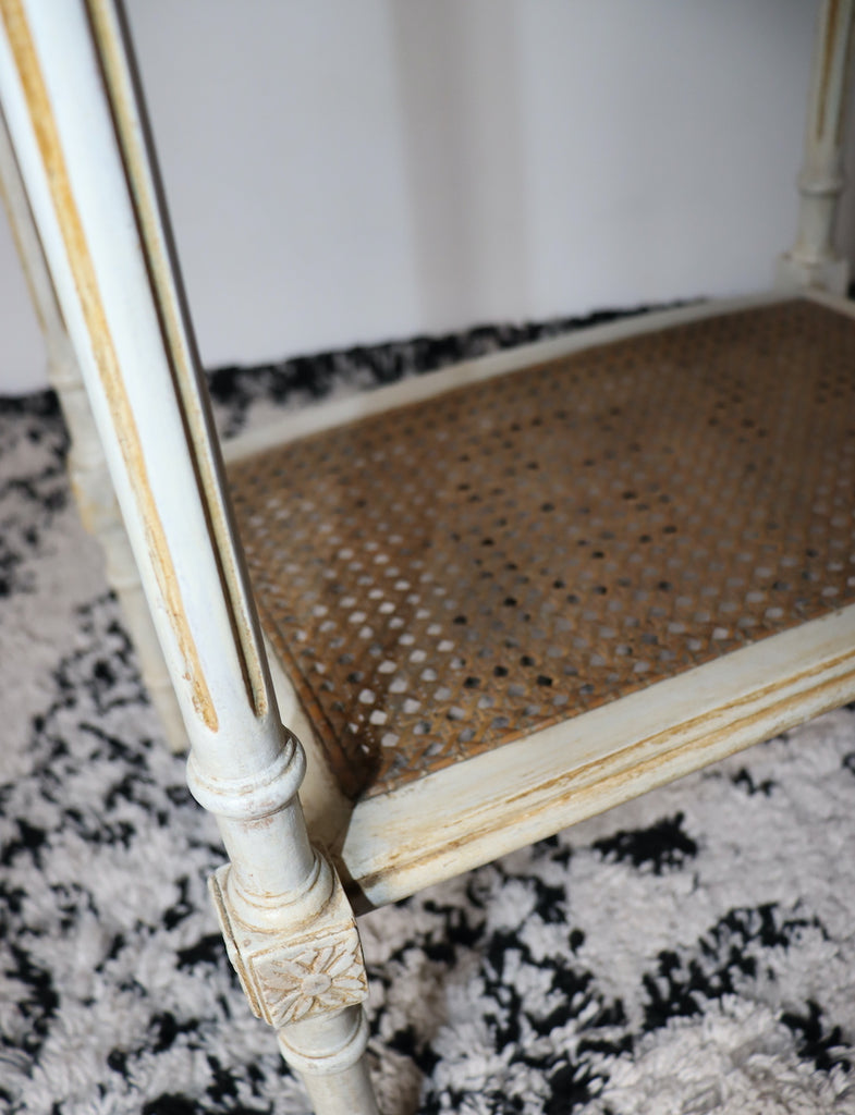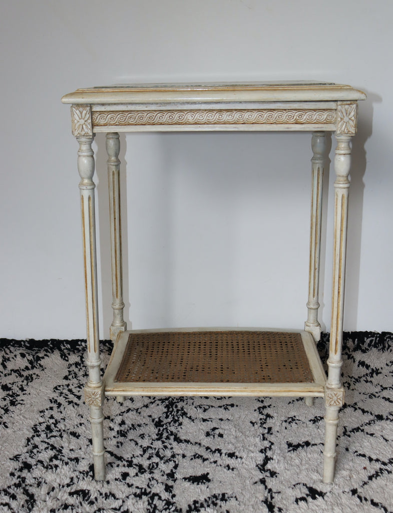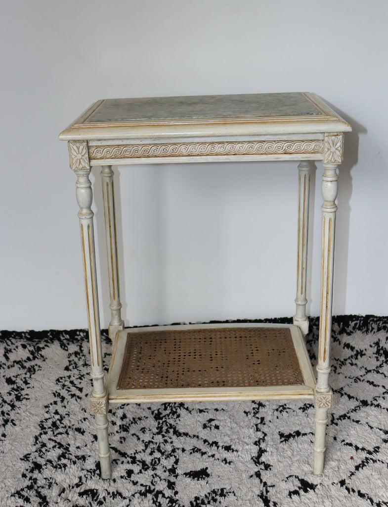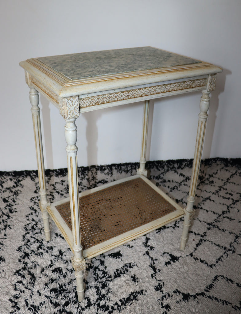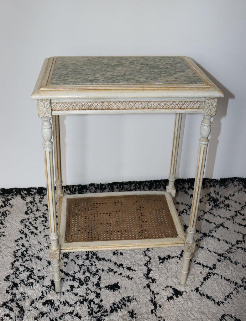 Cette  desserte (guéridon ?) ne laisse pas indifférent, tant par sa forme et ses matériaux. Recouverte d'une plaque de marbre vert aux tons doux, elle offre aussi en partie basse, une tablette cannée en parfait état.