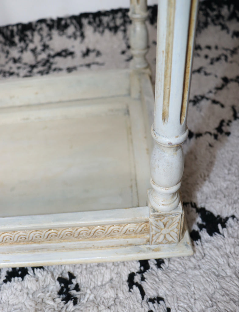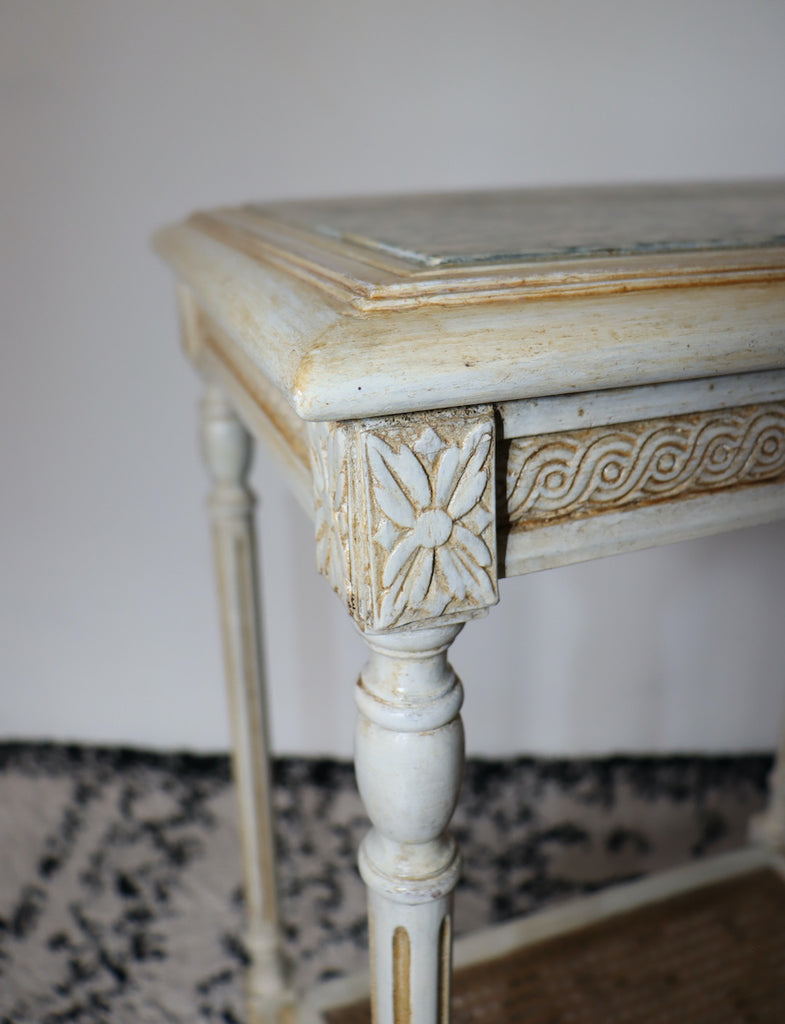 Les pieds cannelés et les motifs floraux sculptés rappellent un style Louis XVI.
