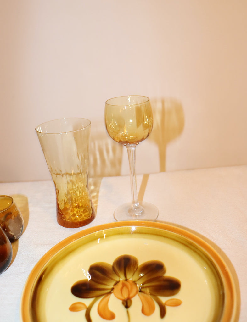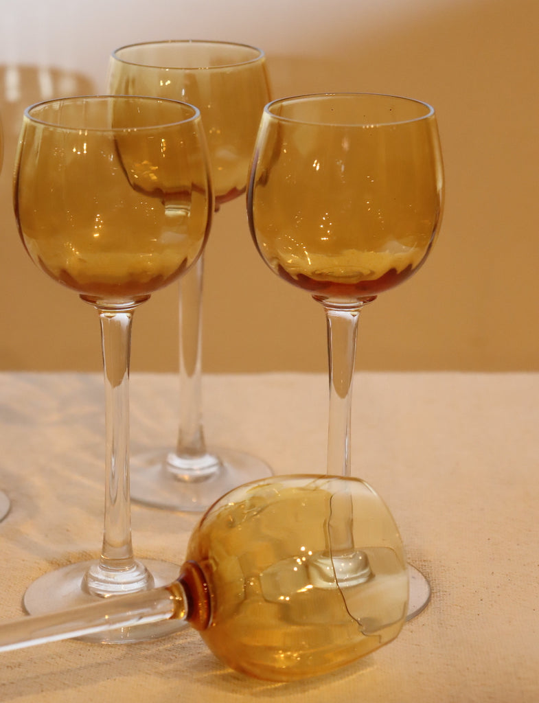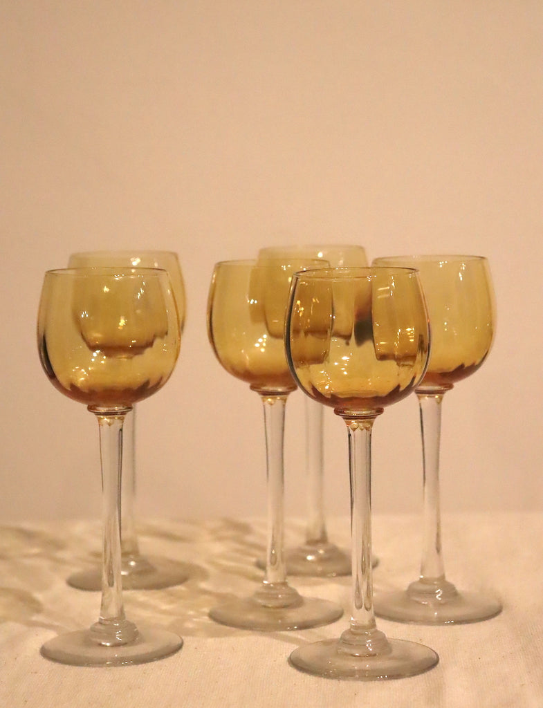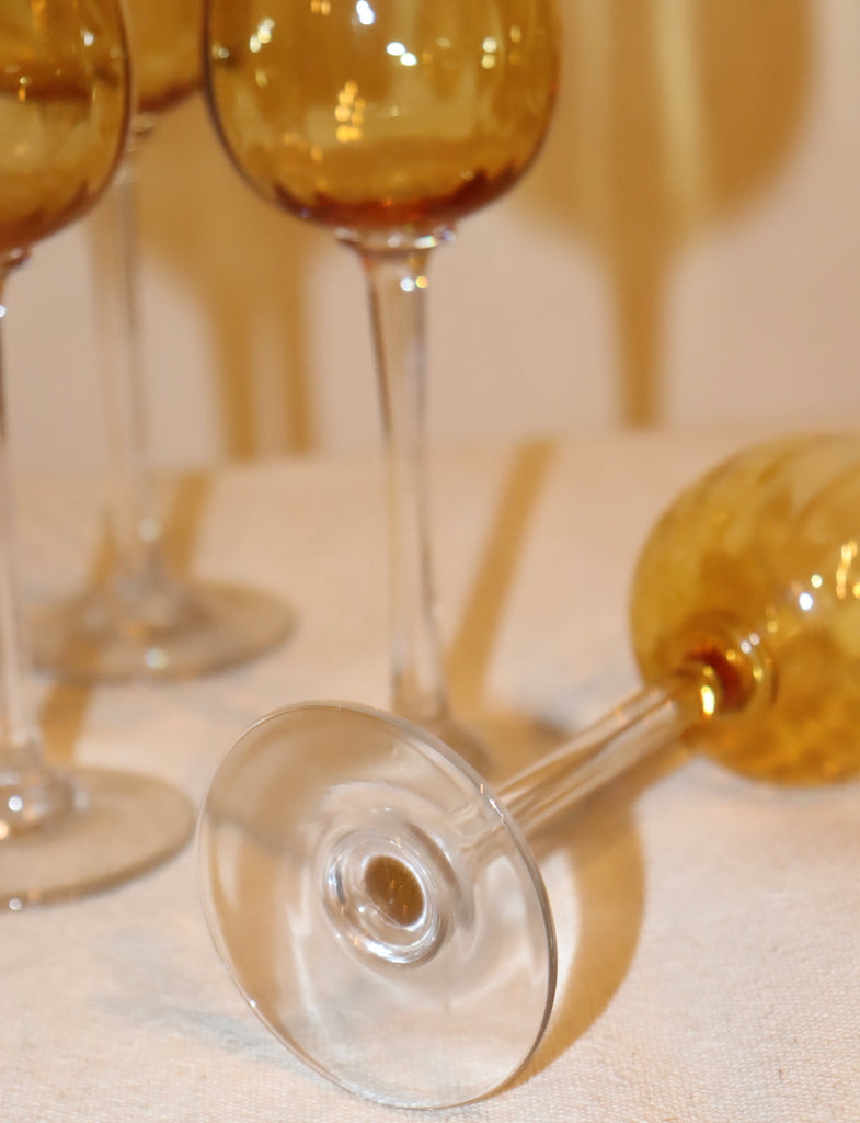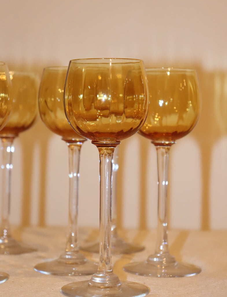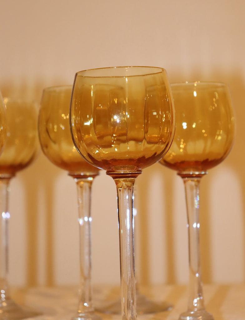 Nous présentons ici 6 superbes verres en cristal à facettes légèrement ambrés. Ces verres appelés verre à vin d'Alsace sont raffinés, ils sauront sublimer vos tables lors d'un apéritif ou d'un repas.