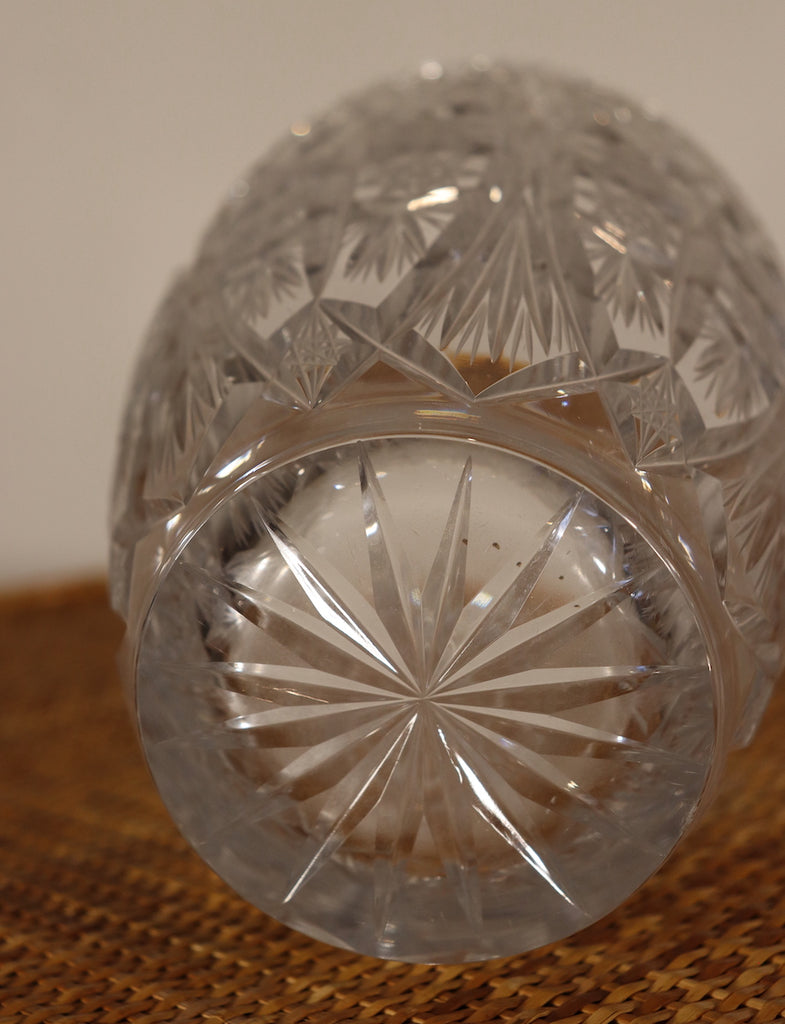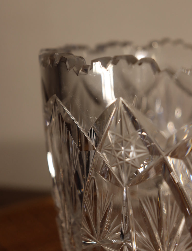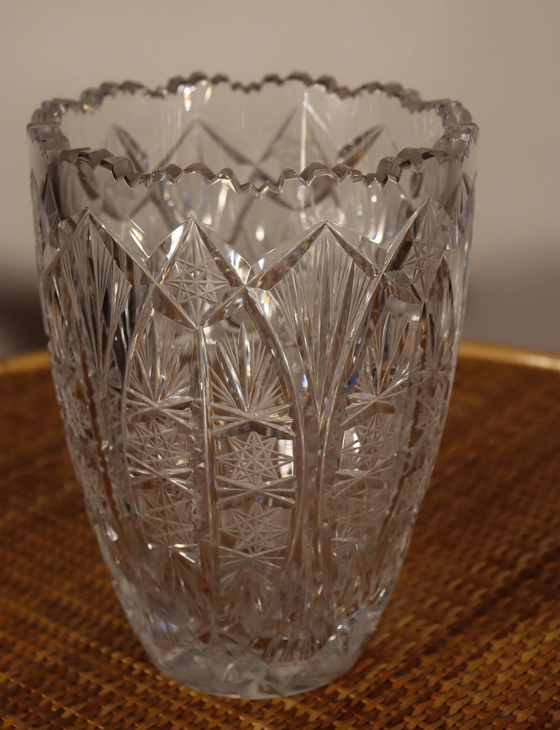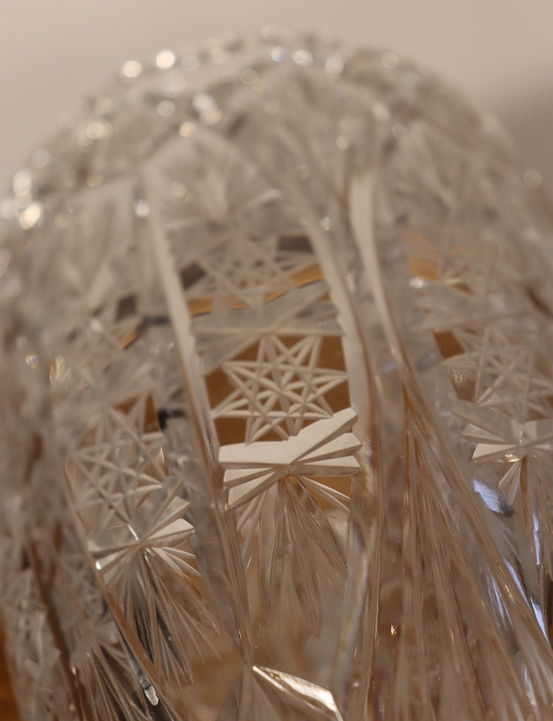Ce vase en cristal de Bohême est imposant par ses dimensions et ses motifs gravés aux étoiles qui recouvrent la surface totale du cylindre.