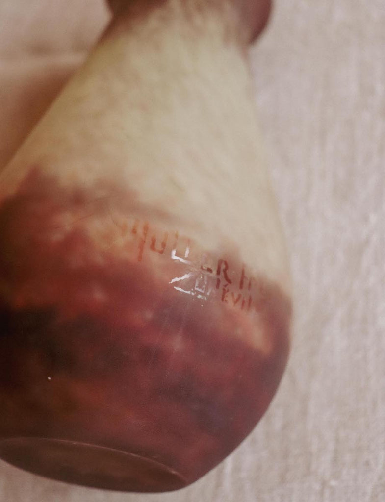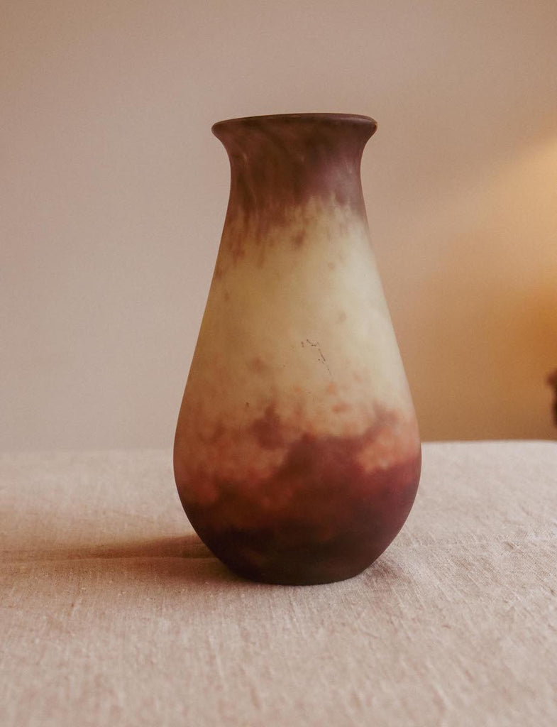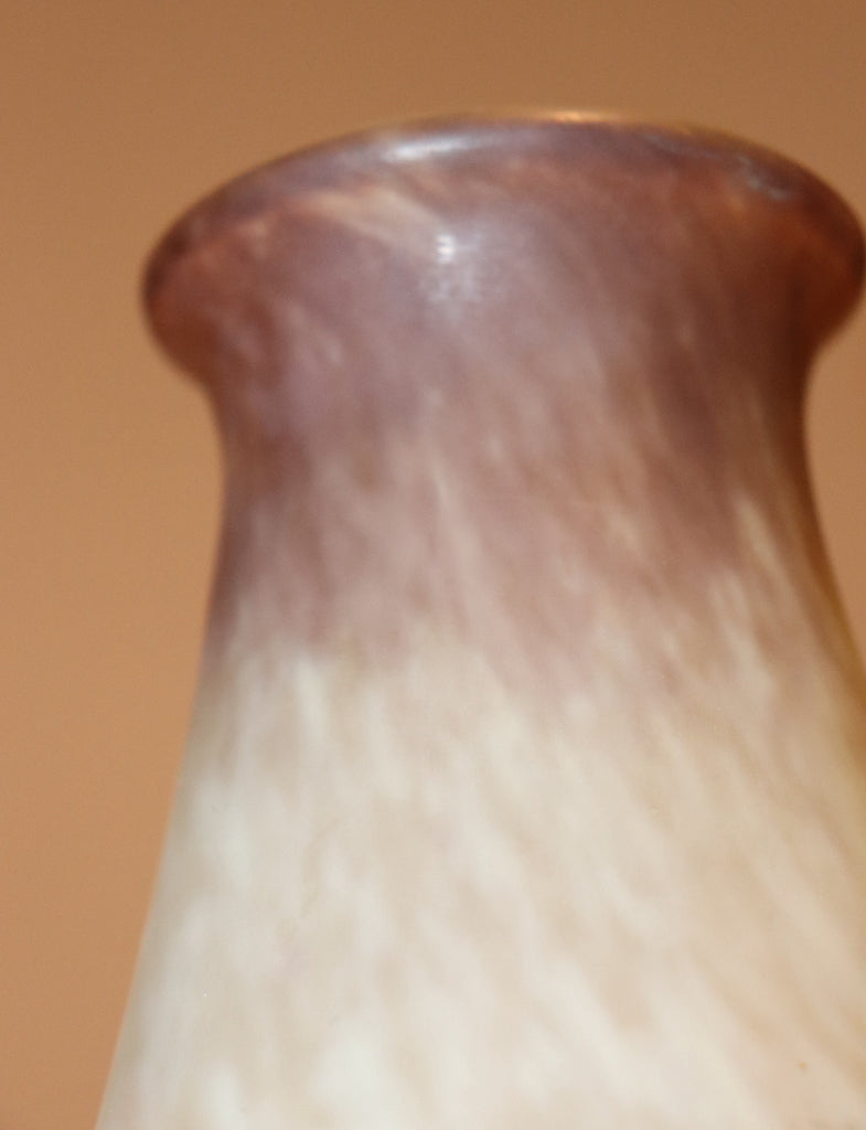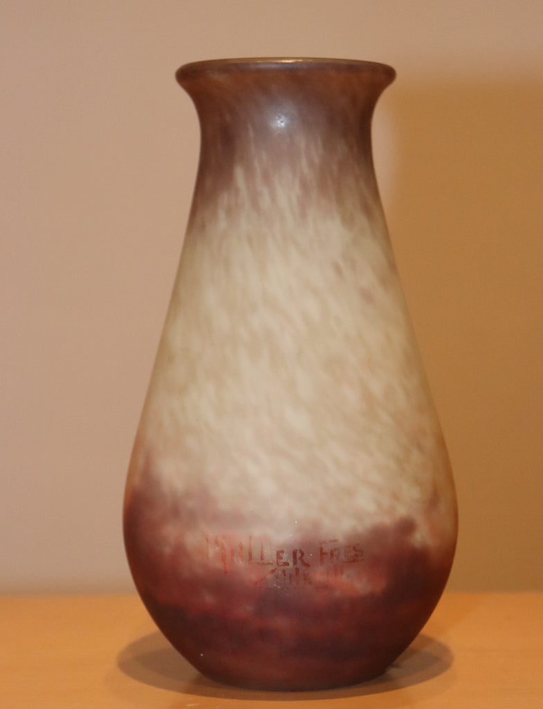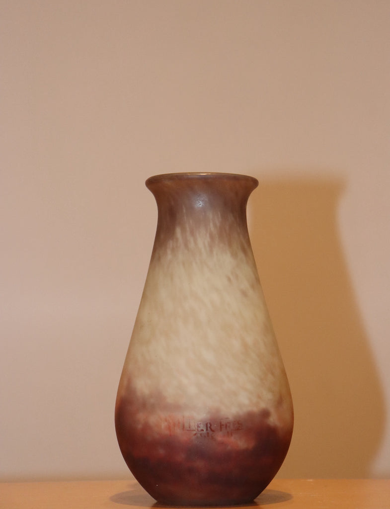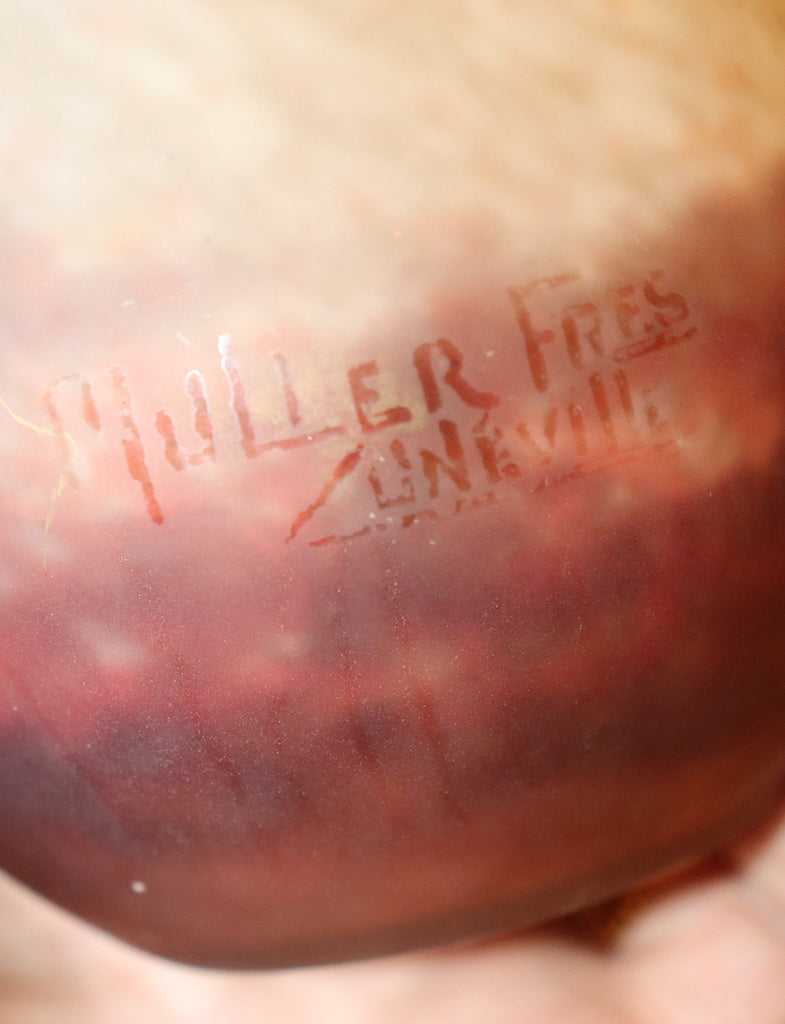 Il est bien entendu signé, et quelle signature ! les Frères Muller ont en effet apposé leur estampille sur ce joli petit vase en pâte de verre aux reflets mouchetés à la couleur d'aubergine.