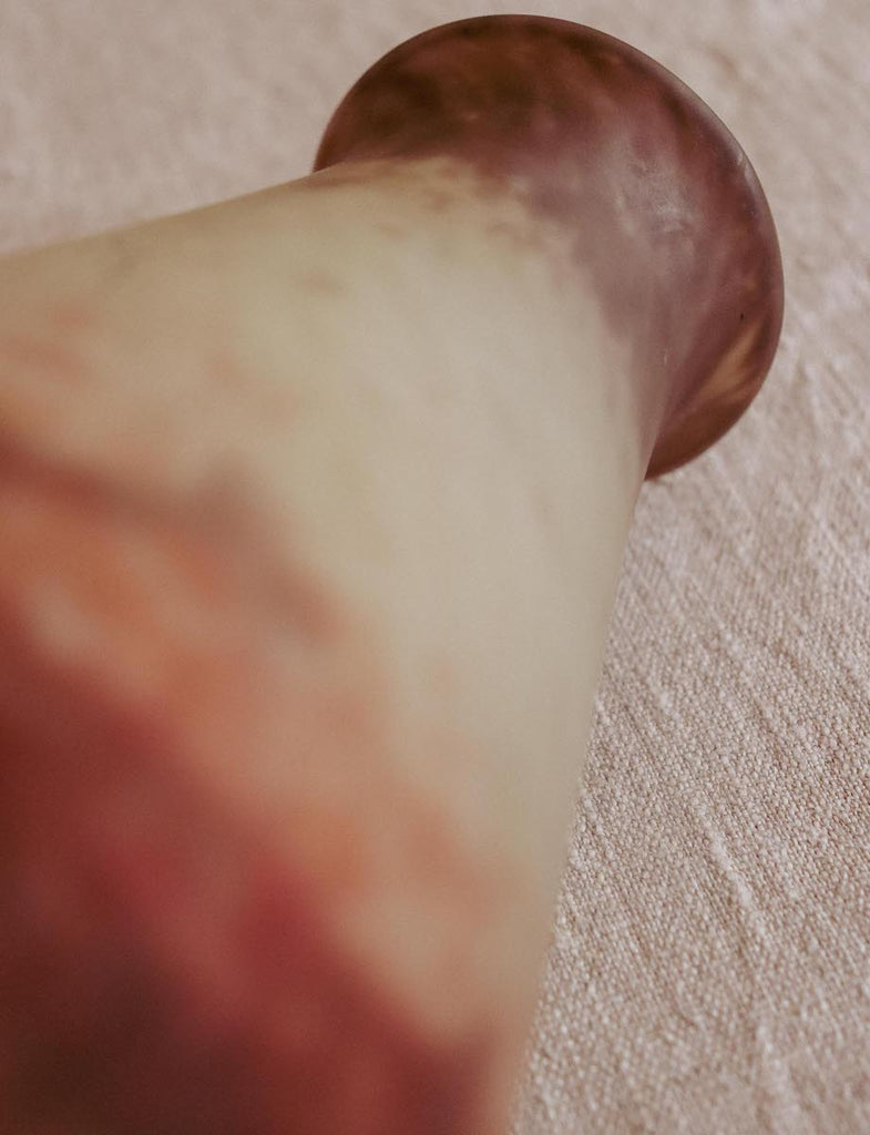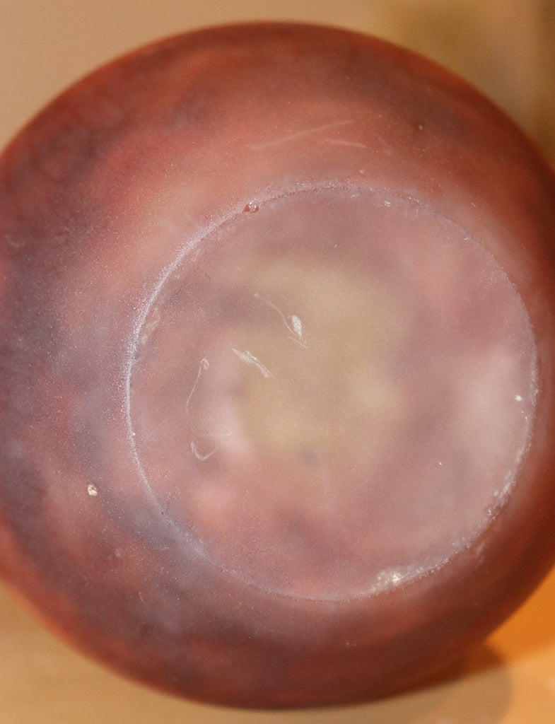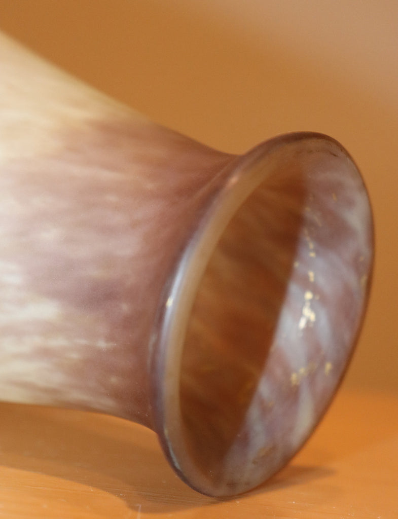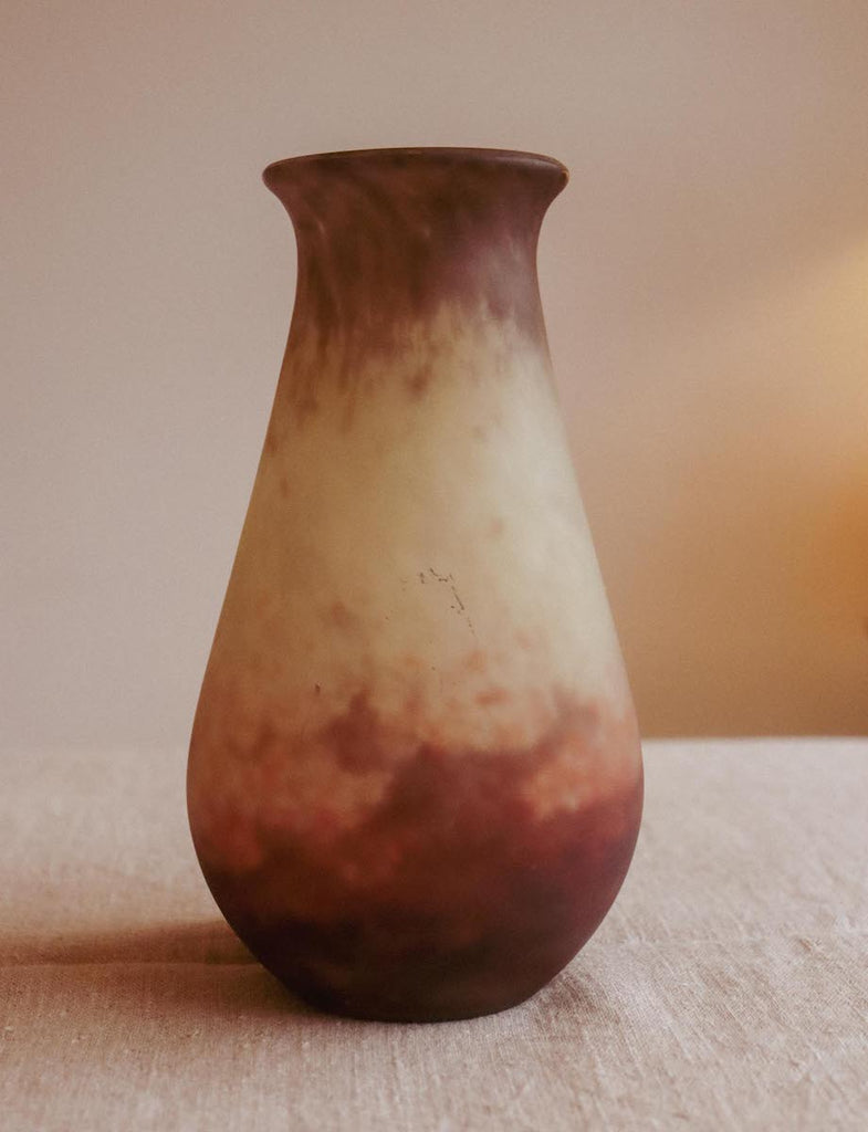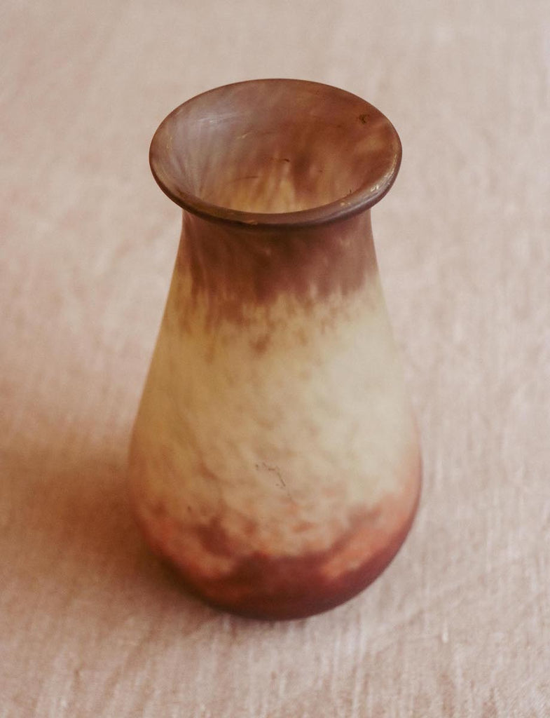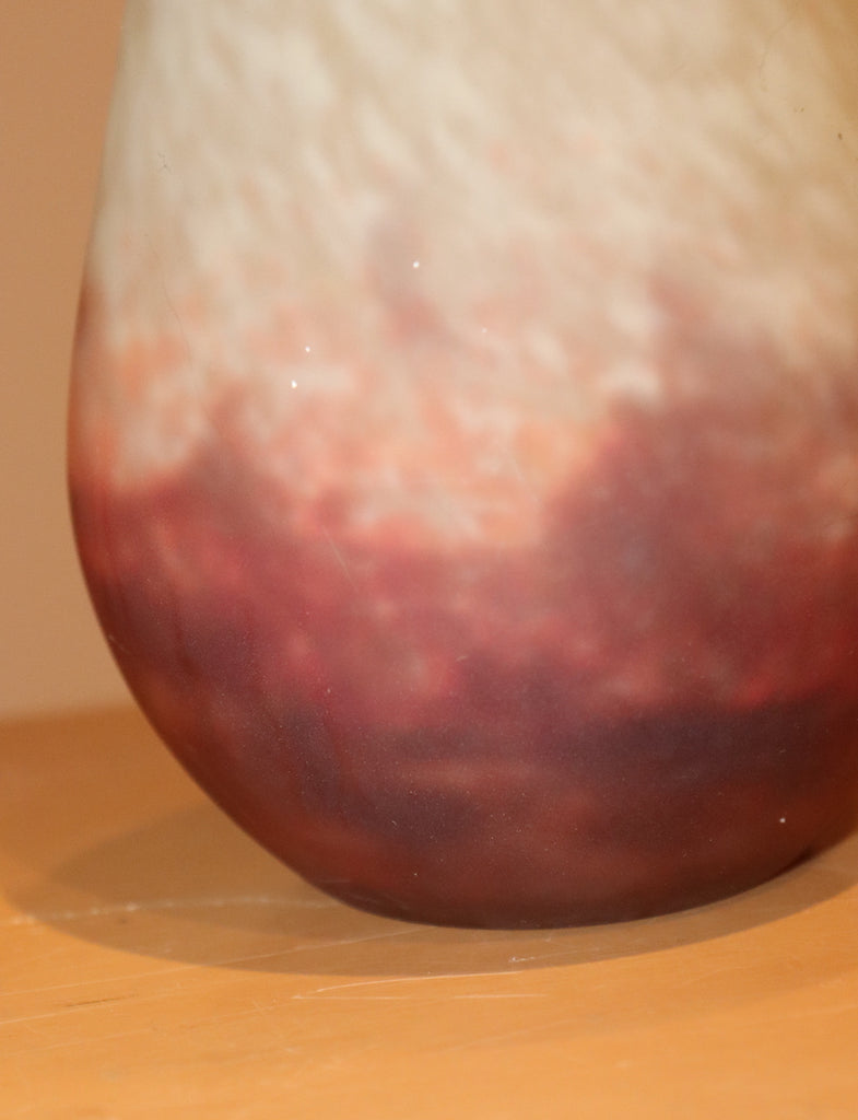 Il est bien entendu signé, et quelle signature ! les Frères Muller ont en effet apposé leur estampille sur ce joli petit vase en pâte de verre aux reflets mouchetés à la couleur d'aubergine.